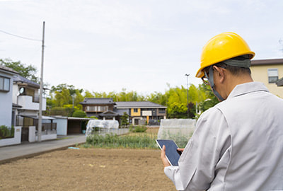 敷地を測量し確認をさせていただきます。周辺環境・方位・日当たり・敷地の状態などを把握します。建築基準法への対応もいたします。