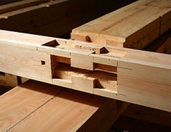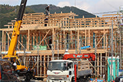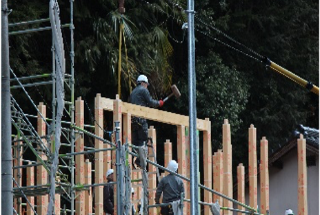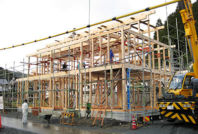 いよいよ棟上げです。早朝から大きなレッカー車がきて大工職人達がたくさん集まり、手慣れた職人達でも現場では緊張感が伝わります。土台だけの状態から柱を立てたりカケヤで組み上げていきます。車知栓継ぎ(しゃちせんつぎ)・金輪継ぎ(かなわつぎ)・蟻組み(ありぐみ)と職人の技も光ります。この日の為に作業場で丁寧に手刻みした材料が実際正確に組み上がる気持ちよさここに大工の喜びと達成感を味わう瞬間。当日で家の骨組みが出来上がり、建物の形が現れとても感動的です。棟上げ後は、当社とお施主様で上棟式を行います。土地や建築を司る神様に感謝し、工事の安全と建物が末永く丈夫でありますようにとお祈りして安全祈願とお清めをします。お餅やお菓子投げもできます。