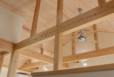 木造軸組工法は、木と木を組むことで高い耐久性を得られます。厳選された国産材の無垢の木をふんだんに使い、屋根には丈夫な瓦、壁や天井にはできるだけ自然素材を使います。一つ一つ「ほんもの」にこだわり、素材の良さを生かして長く大切に次世代につなげる家づくりをします。