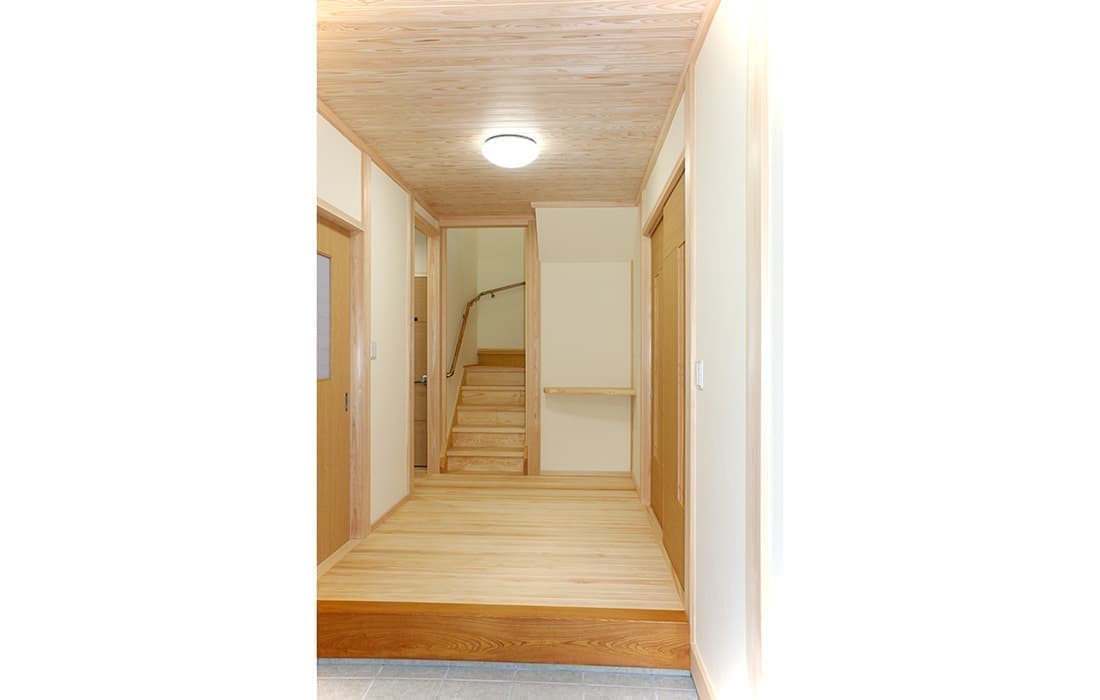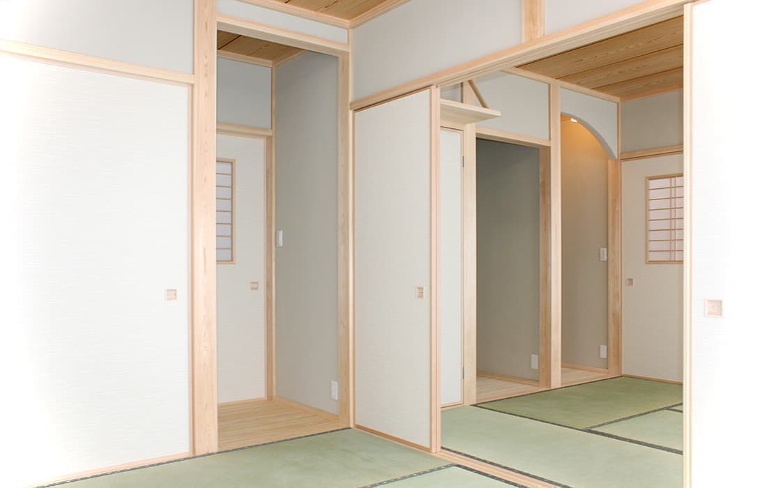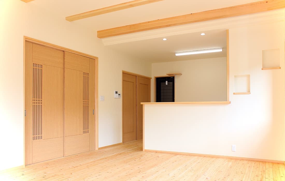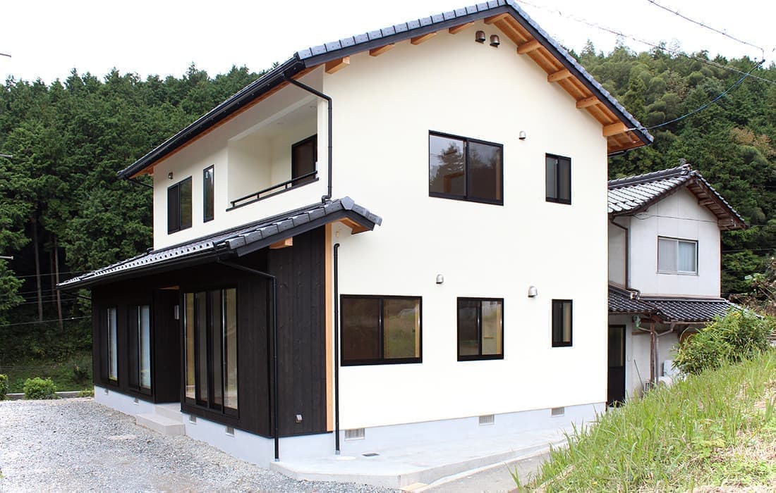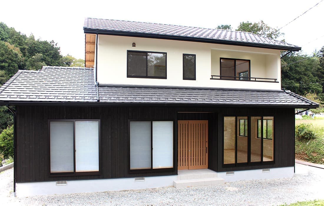 「木組みの家」和風モダン住宅 シャープな新和風の家 新築 焼杉板と白い壁が落ち着いた印象の外観。LDKは桧の床、壁には珪藻土と素材にもこだわりました。2世帯住宅ということもあり、対面キッチンは家族を感じながら作業できてとても魅力的です。2間続きの和室は大勢のお客様にも対応できて落ち着いた空間です。のんびりと心を潤す時間を過ごせる住まいです。 前へ 建築実例一覧 次へ