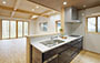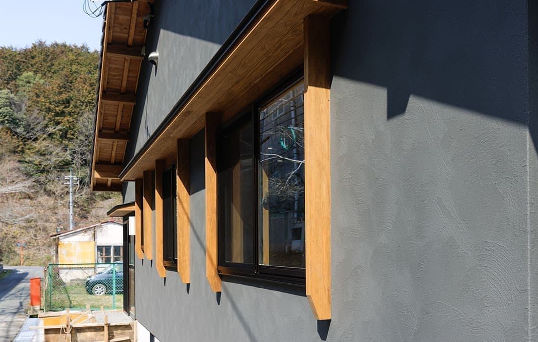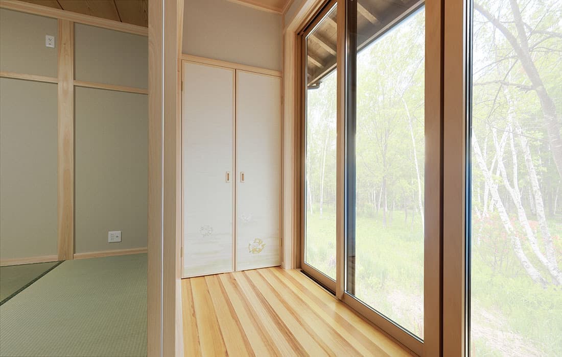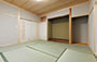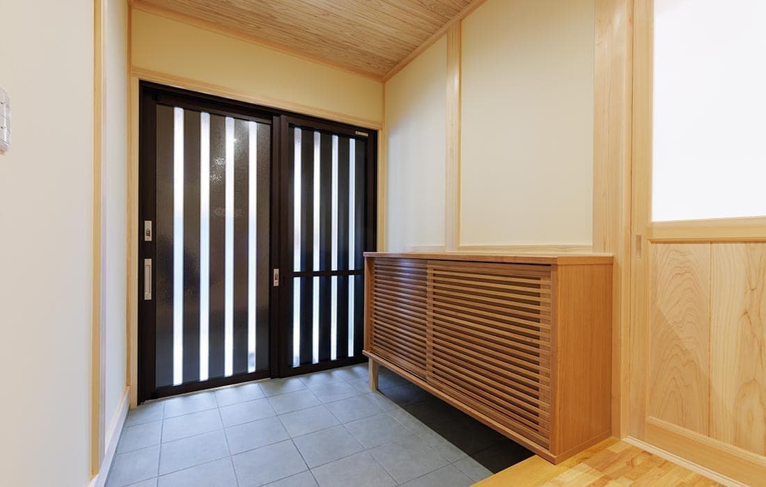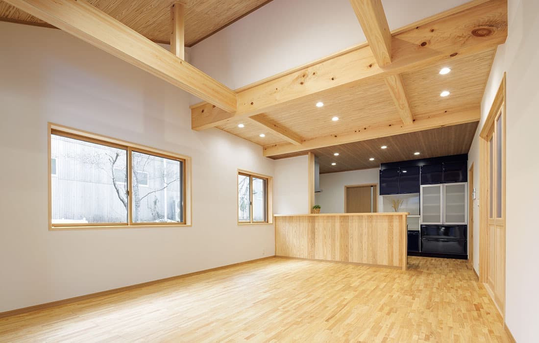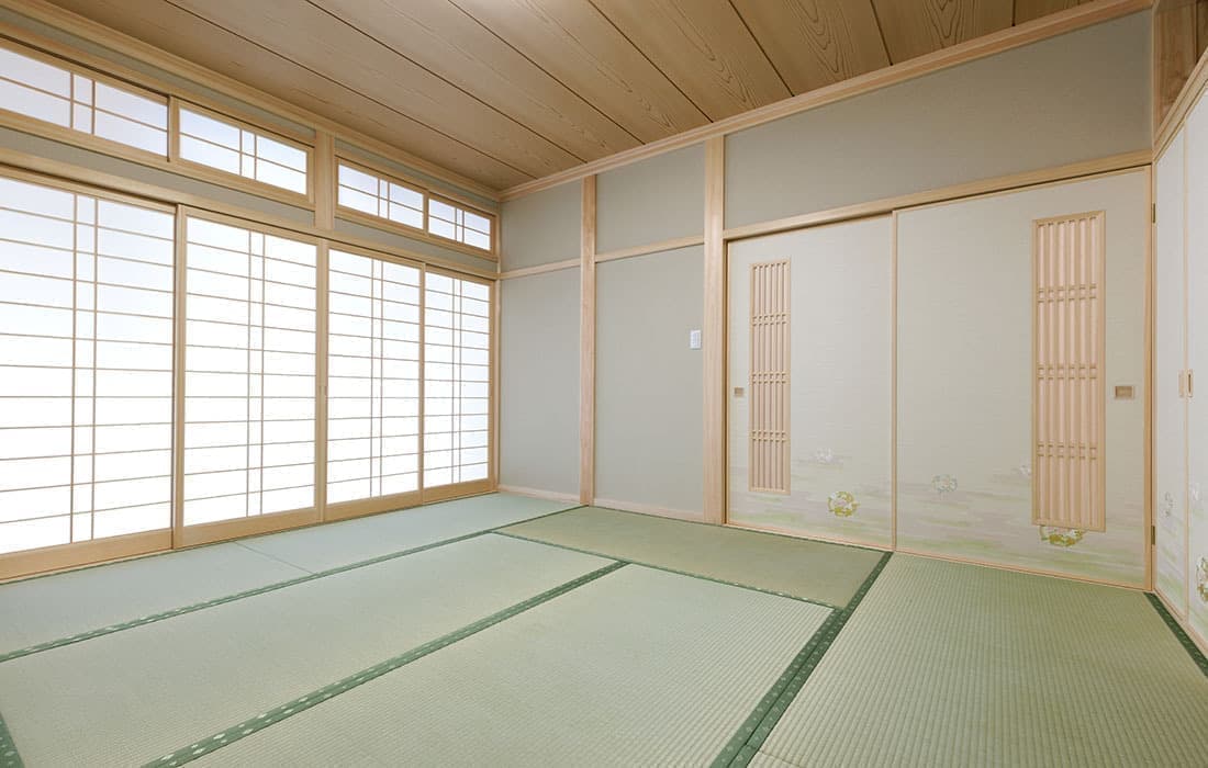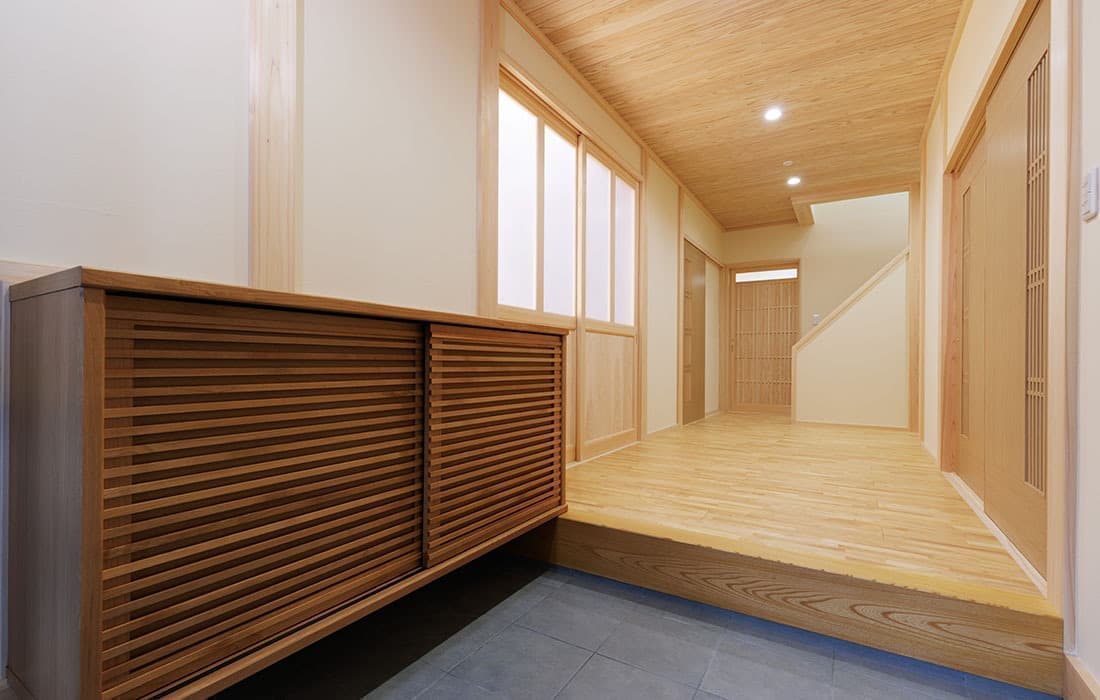 四季折々の緑に彩られた中に溶け込むような外観。外壁はジョリパット塗りで職人のコテ仕上げの家です。軒下、窓の飾りは外壁のアクセントになり自然な風合いが特徴です。リビングは杉板張りの勾配天井が縦の広がりを強調。吹き抜けの大空間の中に桧材の化粧梁。開放感にあふれたリビングを実現しています。玄関と水廻りの壁には珪藻土を使用。珪藻土の質感が際立ち自然素材の優しい印象に仕上げています。和室は職人の手仕事による真壁・ジュラク塗りが本格和風住宅の良さを引き出しています。障子からは優しい光が入り、国産いぐさの香りに包まれた落ち着きのある空間に。縁側もあり季節の草花を眺めてゆったりとした時間を過ごせる心地よい住まいです。