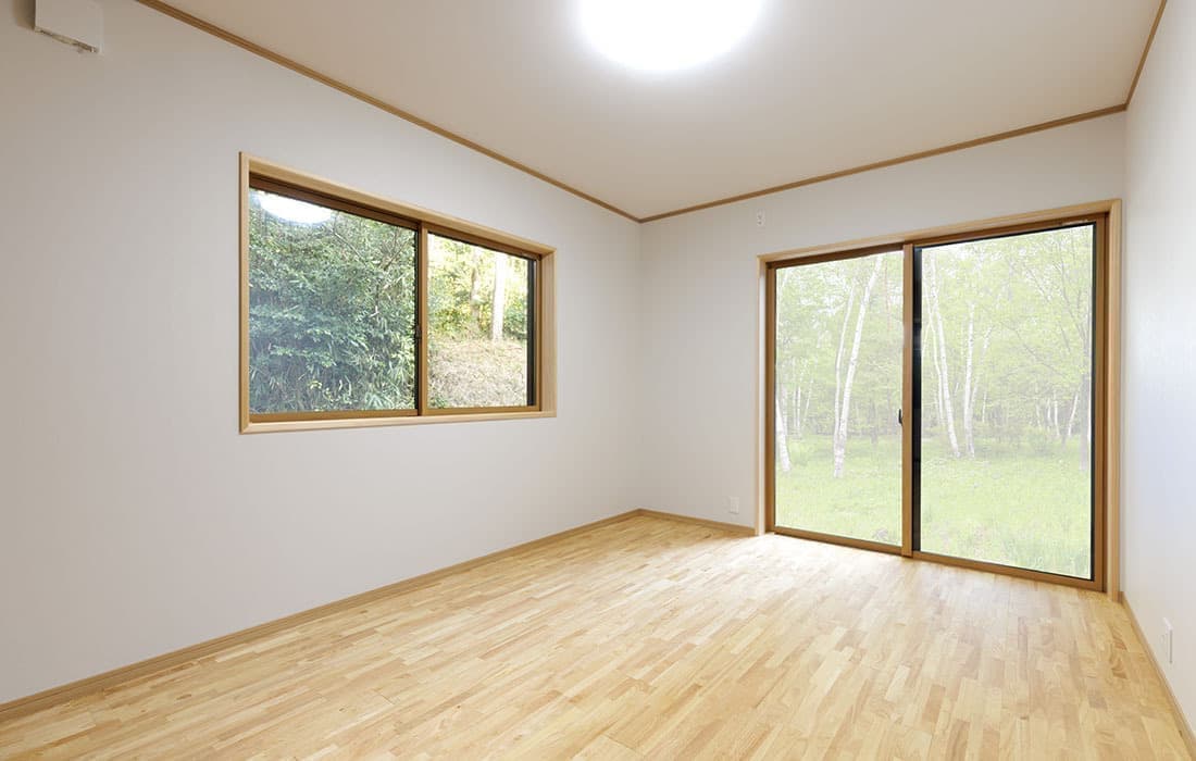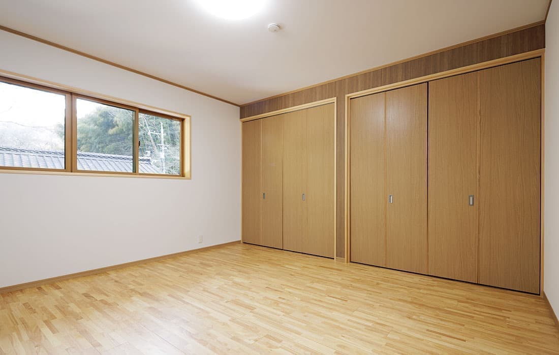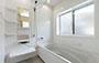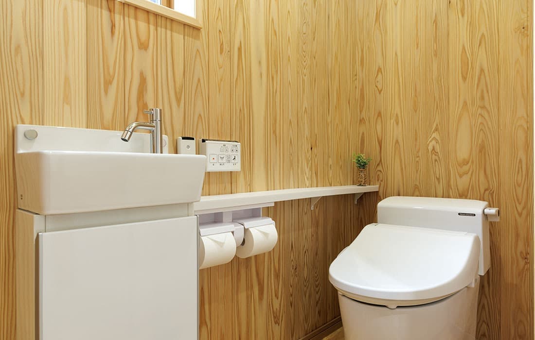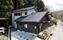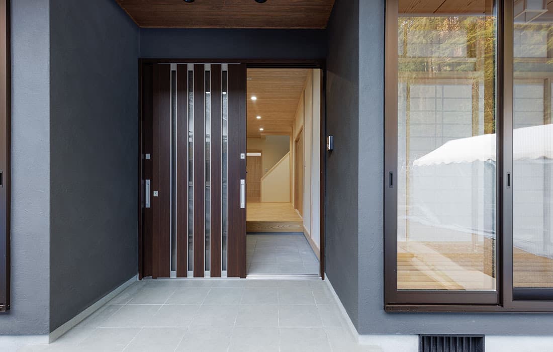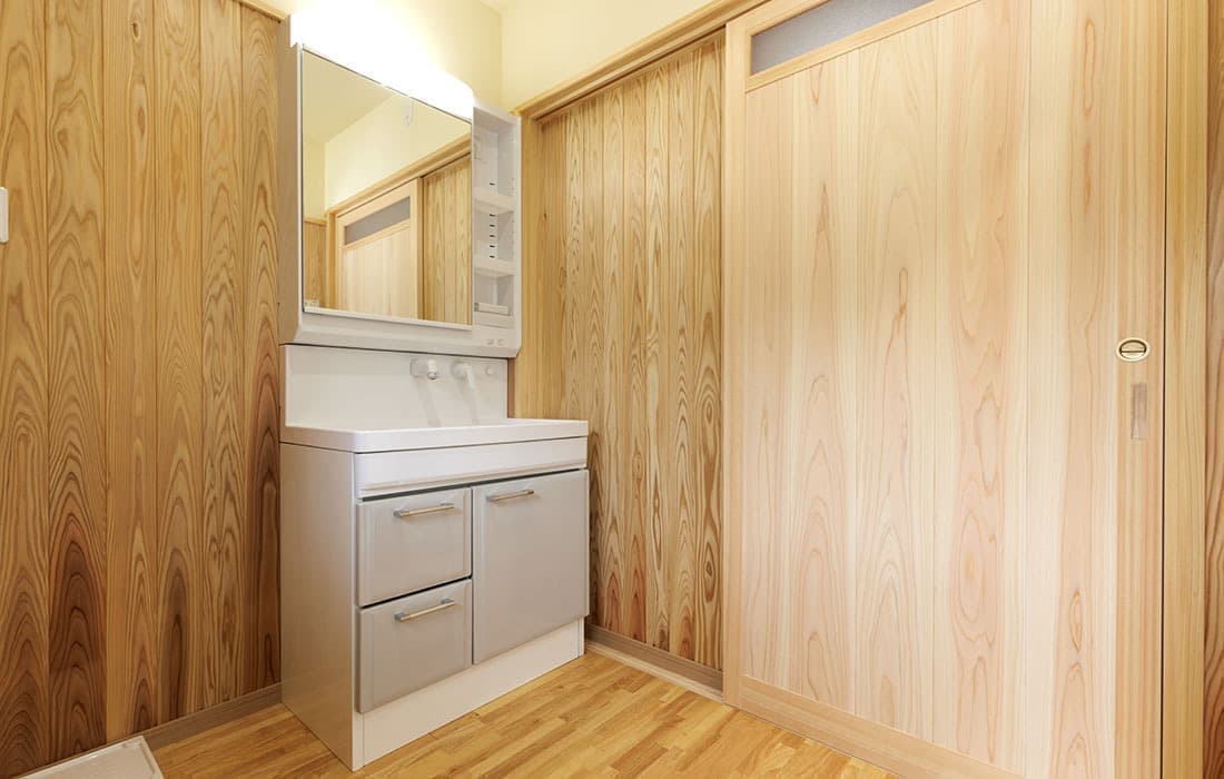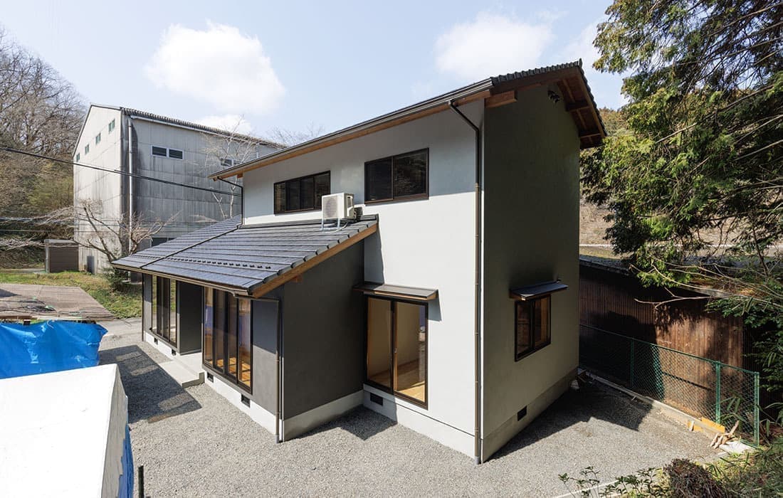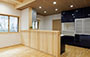 四季折々の緑に彩られた中に溶け込むような外観。外壁はジョリパット塗りで職人のコテ仕上げの家です。軒下、窓の飾りは外壁のアクセントになり自然な風合いが特徴です。リビングは杉板張りの勾配天井が縦の広がりを強調。吹き抜けの大空間の中に桧材の化粧梁。開放感にあふれたリビングを実現しています。玄関と水廻りの壁には珪藻土を使用。珪藻土の質感が際立ち自然素材の優しい印象に仕上げています。和室は職人の手仕事による真壁・ジュラク塗りが本格和風住宅の良さを引き出しています。障子からは優しい光が入り、国産いぐさの香りに包まれた落ち着きのある空間に。縁側もあり季節の草花を眺めてゆったりとした時間を過ごせる心地よい住まいです。