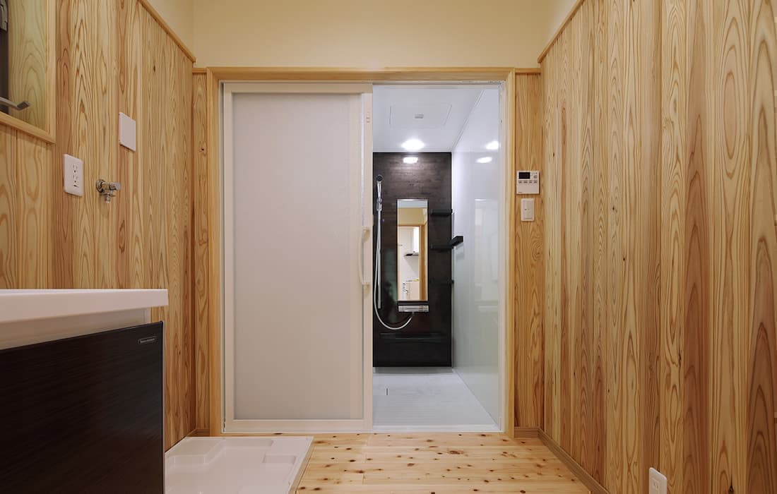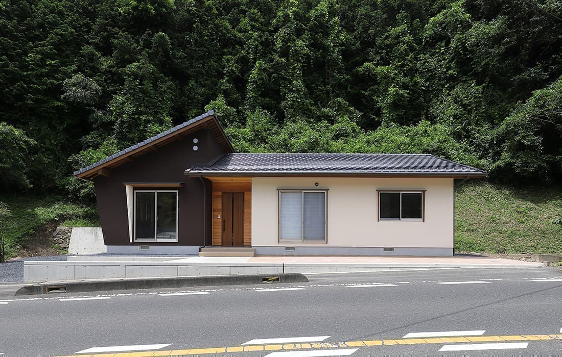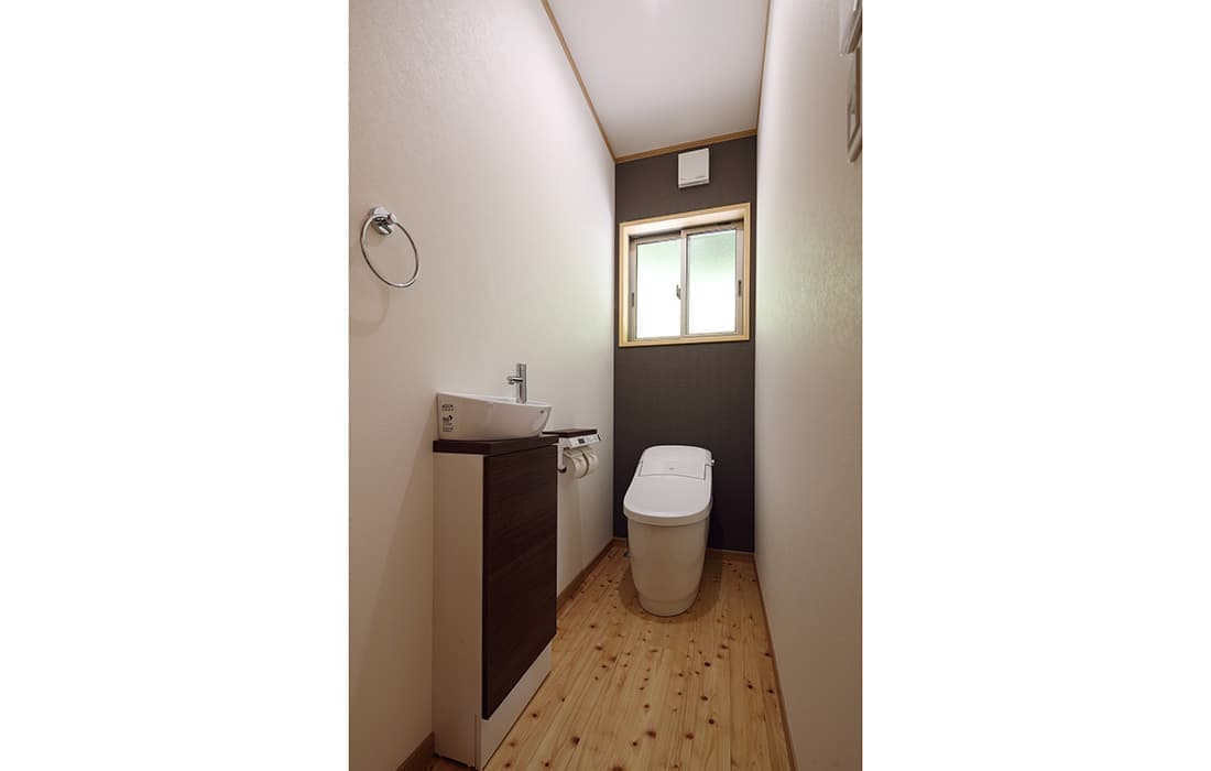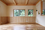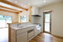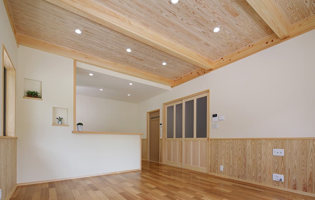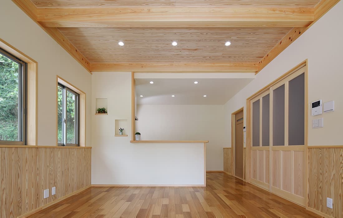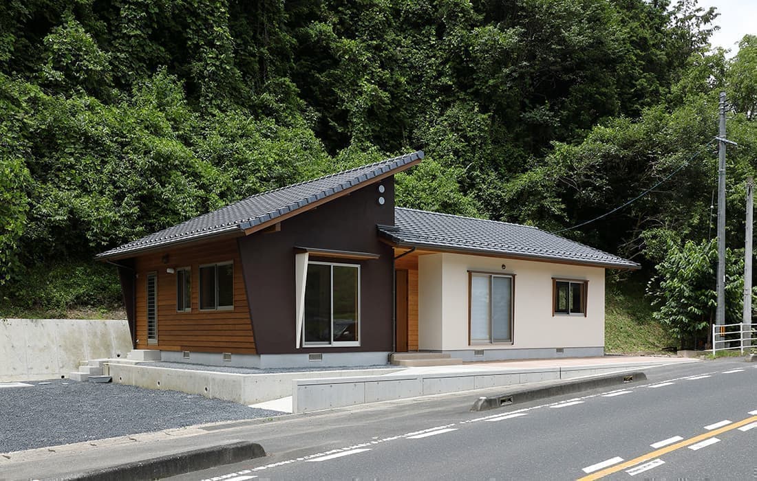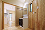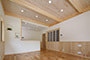 「木組みの家」洋風モダン住宅 wood×斜め壁 平屋の家 新築 切り妻屋根に杉の板貼りが目を引く外観。外壁に変化をつけるため斜め壁にしてデザインしています。窓にも木枠を斜めにして同じデザインで統一感をプラス。濃茶、白、木の色合いで3色に彩った外観が印象的な平屋です。LDKは高い天井で開放的にし、キッチンから洗面所、浴室と繋がり生活動線を考えた間取りになっています。家族の気配を感じながらリビングはいつもみんなが集まる癒しの場所です。 前へ 建築実例一覧 次へ