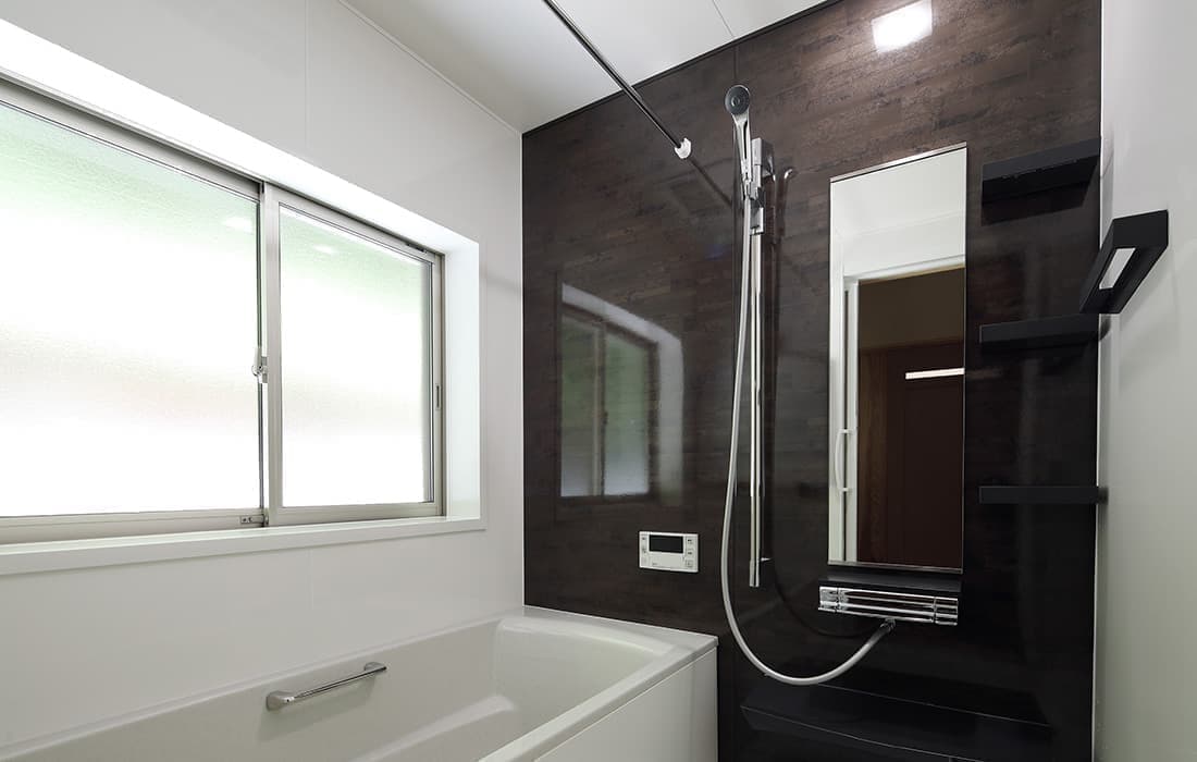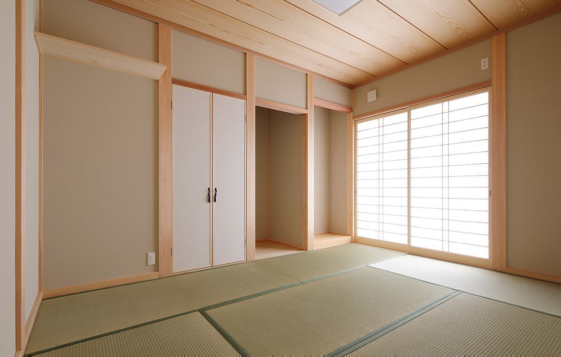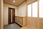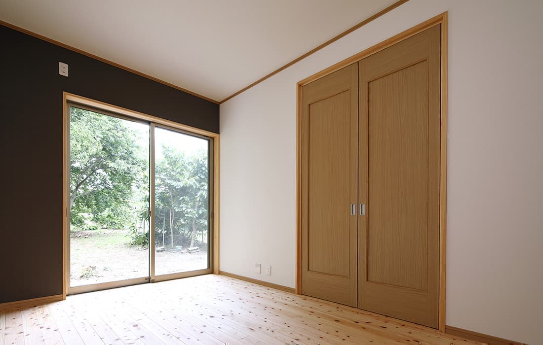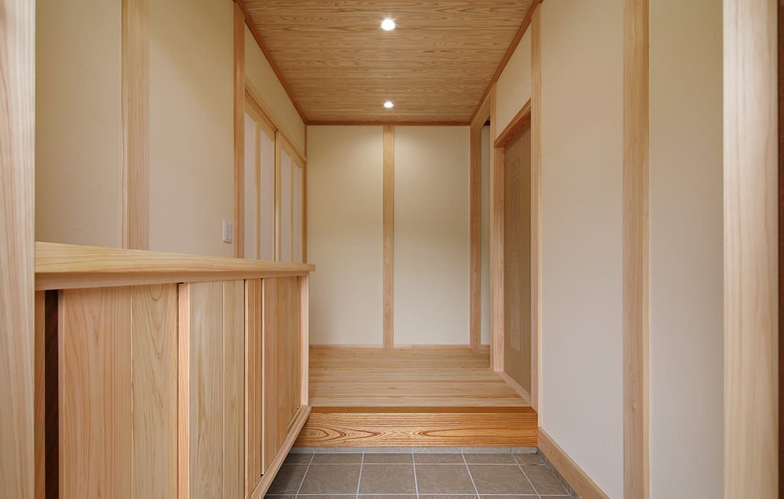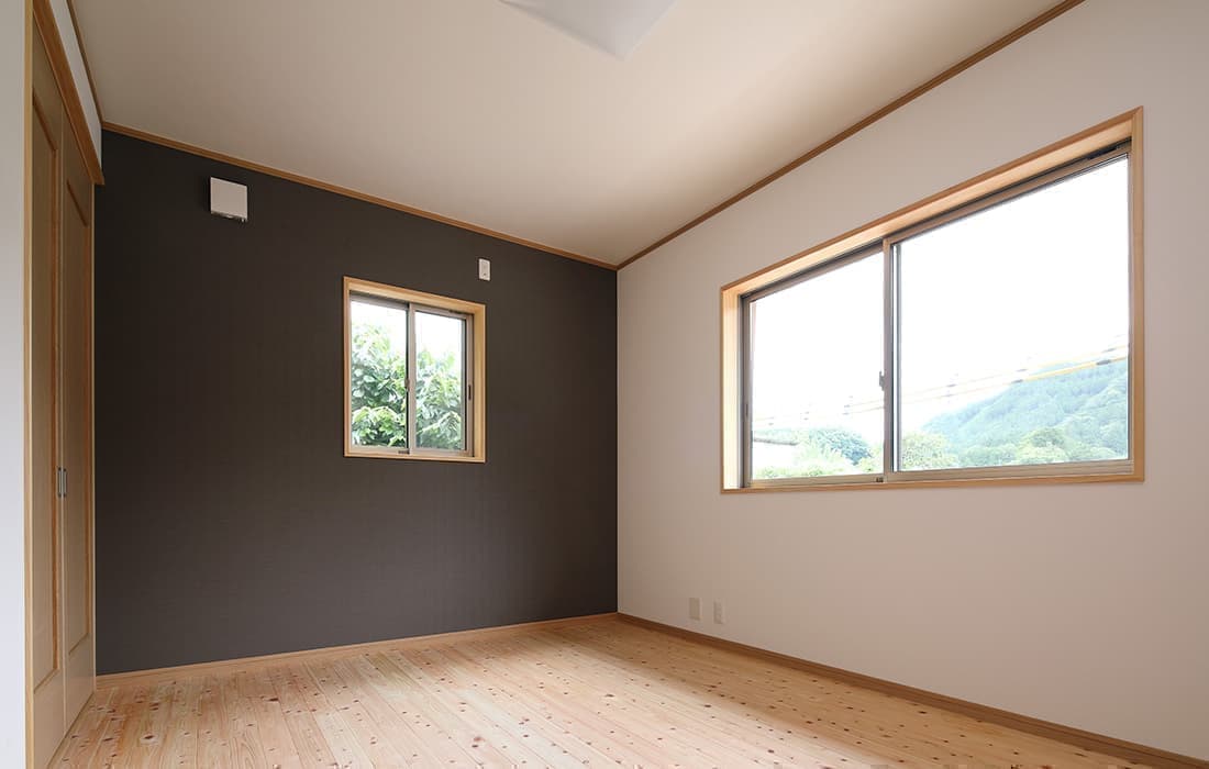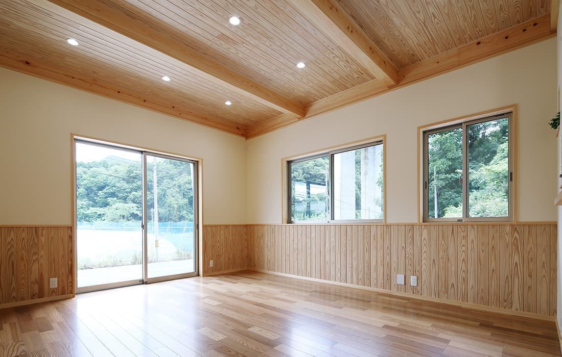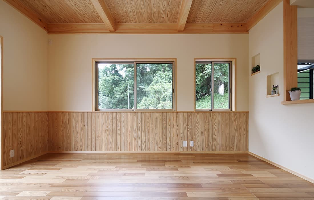 「木組みの家」洋風モダン住宅 wood×斜め壁 平屋の家 新築 切り妻屋根に杉の板貼りが目を引く外観。外壁に変化をつけるため斜め壁にしてデザインしています。窓にも木枠を斜めにして同じデザインで統一感をプラス。濃茶、白、木の色合いで3色に彩った外観が印象的な平屋です。LDKは高い天井で開放的にし、キッチンから洗面所、浴室と繋がり生活動線を考えた間取りになっています。家族の気配を感じながらリビングはいつもみんなが集まる癒しの場所です。 前へ 建築実例一覧 次へ