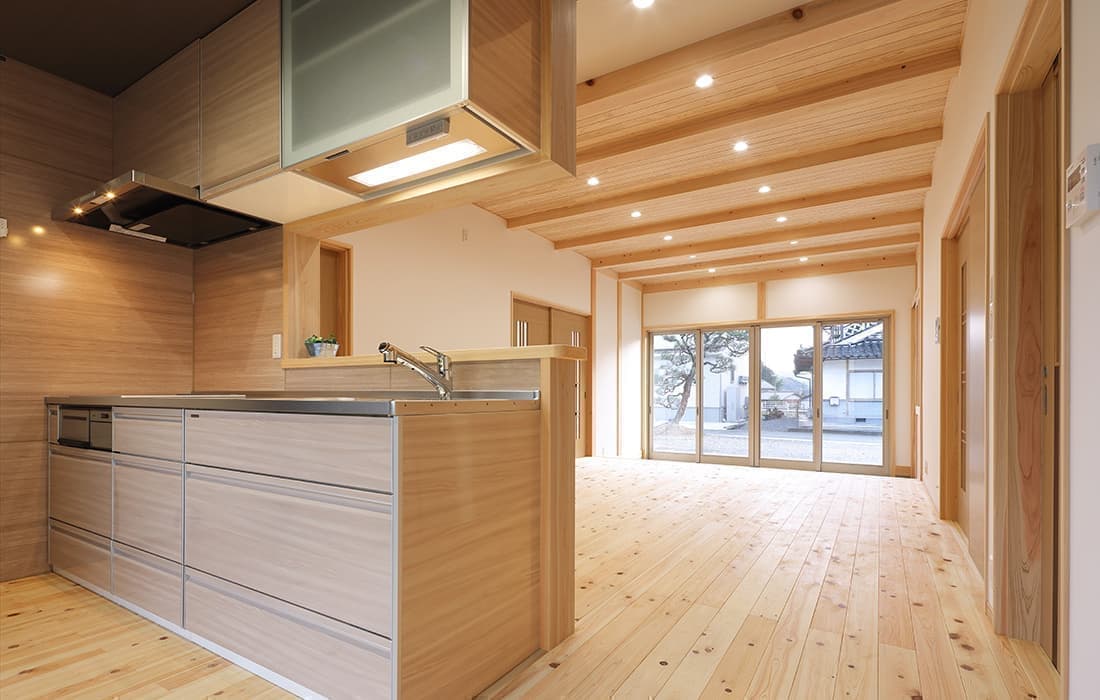 「木組みの家」洋風モダン住宅 杉板貼り平屋の家 新築 外壁を全面杉板貼りにし、木目と節が天然木ならではの奥深い味わいになり魅力的な平屋です。日差しが心地よい土間テラスはリビングとつながり一体感があり広々としています。来客時には、テラスでくつろぎのカフェタイム。リビングの天井も高くし、梁を出し杉板貼りにして開放感のある空間になっています。対面式のキッチンの壁面やフローリングは「ひのき」を使用して温かい雰囲気に。部屋の入口は引き戸を採用し、すべての動線を短くコンパクトにしています。スローライフを楽しむ一人暮らし癒しの住まいです。 前へ 建築実例一覧 次へ