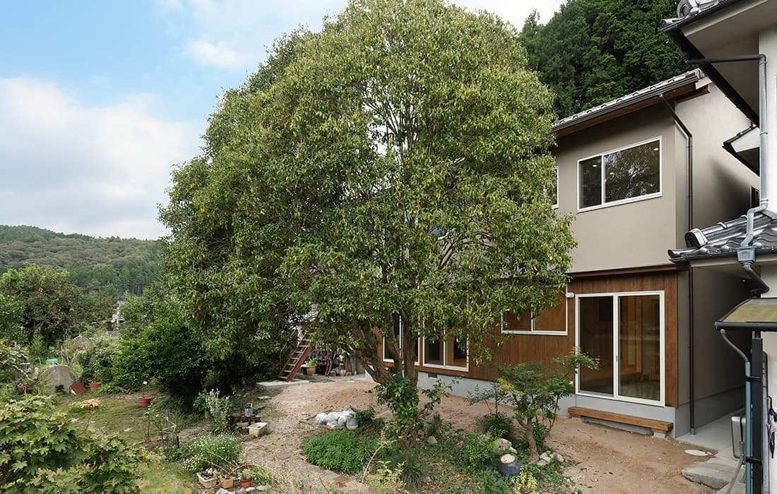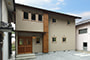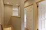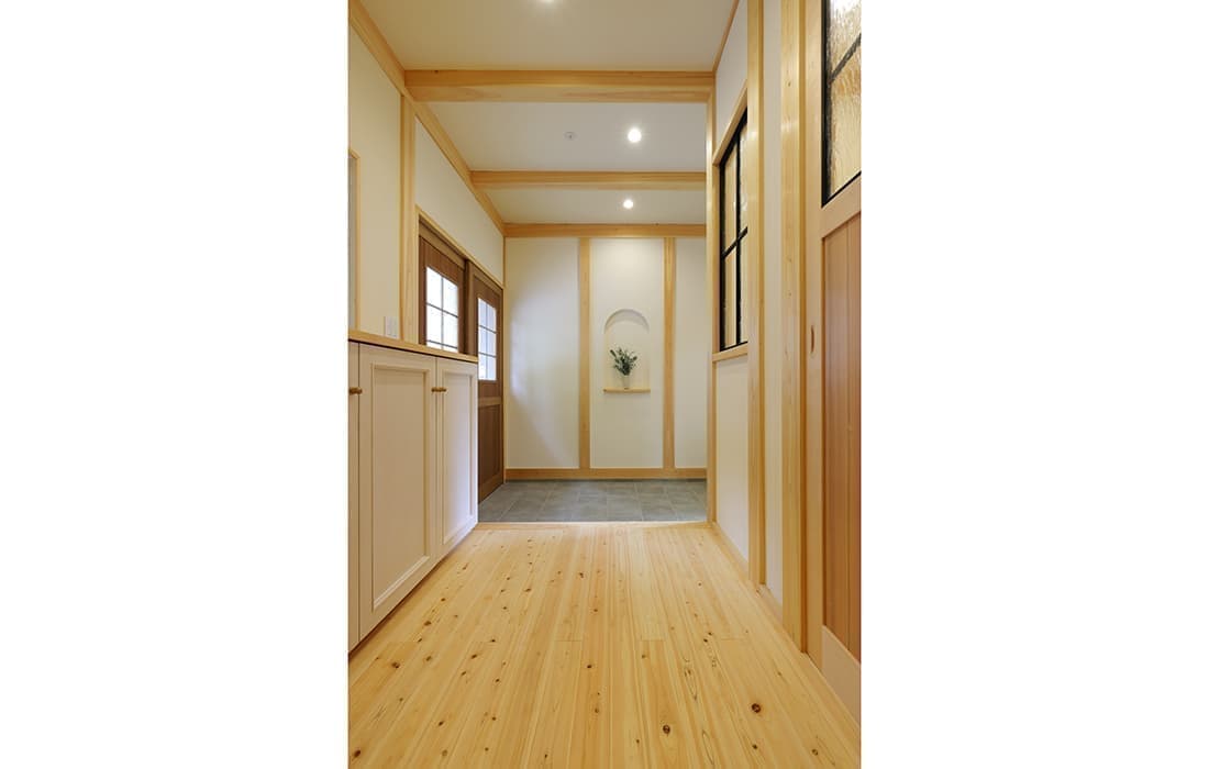 日本家屋の玄関にある土間。もともとは家に上がる為のスペースであった土間が近年では家全体の印象をつける場所となります。土間のスペースを広くとり、おしゃれな空間を演出する場所。薪ストーブを置ける場所。コミュニケーションの場として多様な使い方が出来ます。内部には県産材をたくさん使い構造材、柱、フローリング全てに至るまで無垢のヒノキ材を使用しています。土間とつながるLDKは、尾引天井で空間を広くし珪藻土の柔らかみとネイビーの建具でアクセントのある雰囲気に。リビングに入る建具にはアンティークガラスと黒のアイアンでおしゃれに演出。随所に真鍮をあしらい細部までこだわり。優しい色合いの自然素材を基調としたナチュラルな外観。杉板の柱と木の縁取りをした窓枠、玄関ドアもオリジナル木製建具で柔らかい印象に。