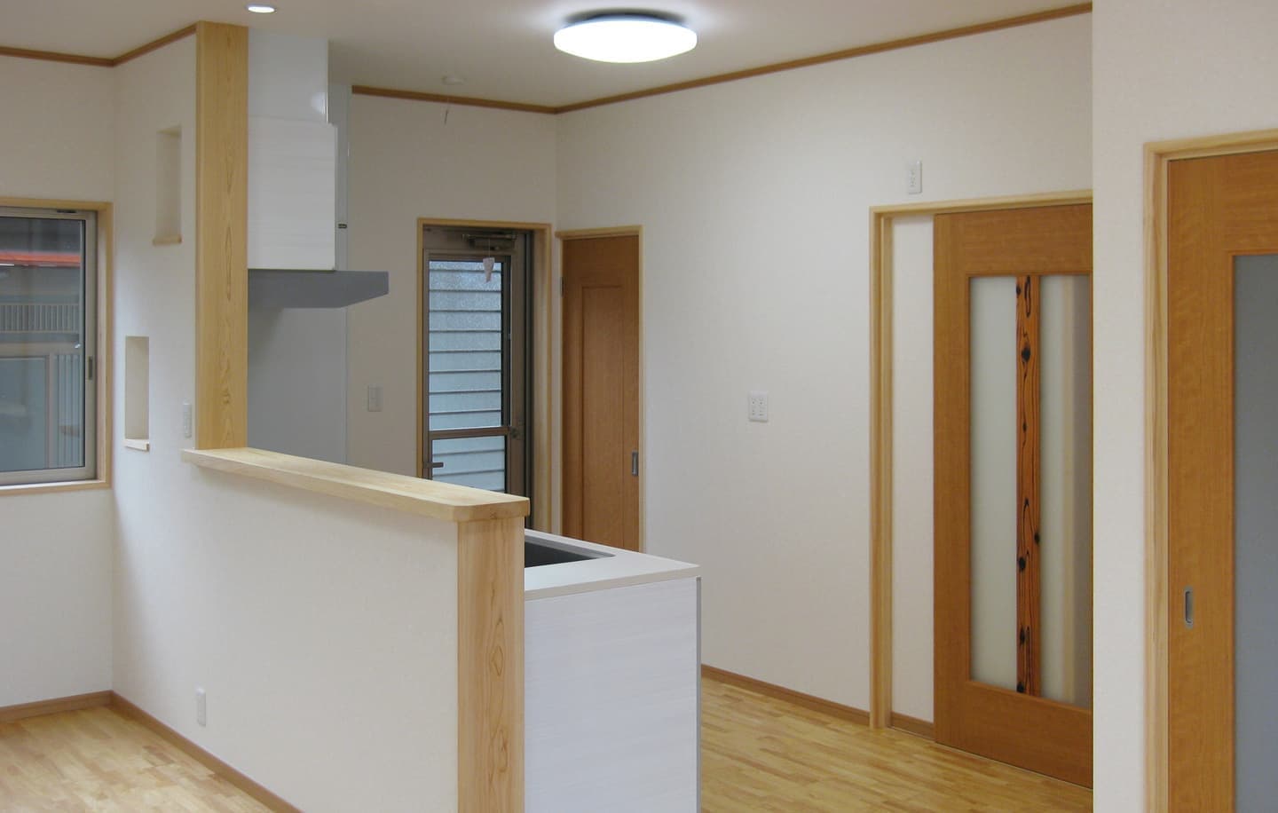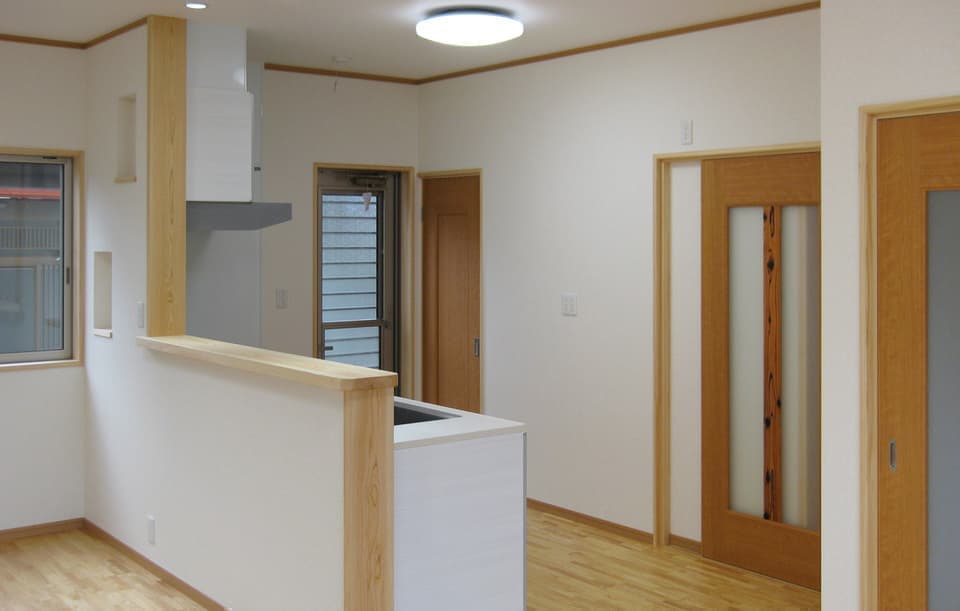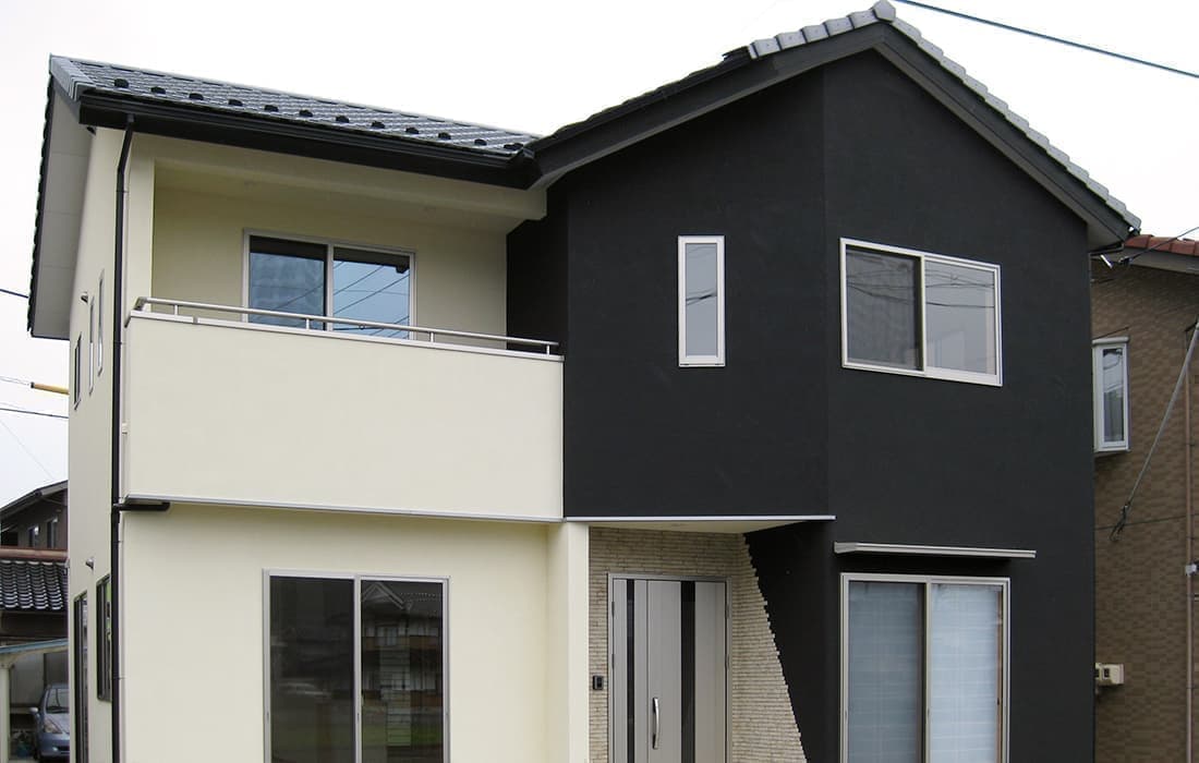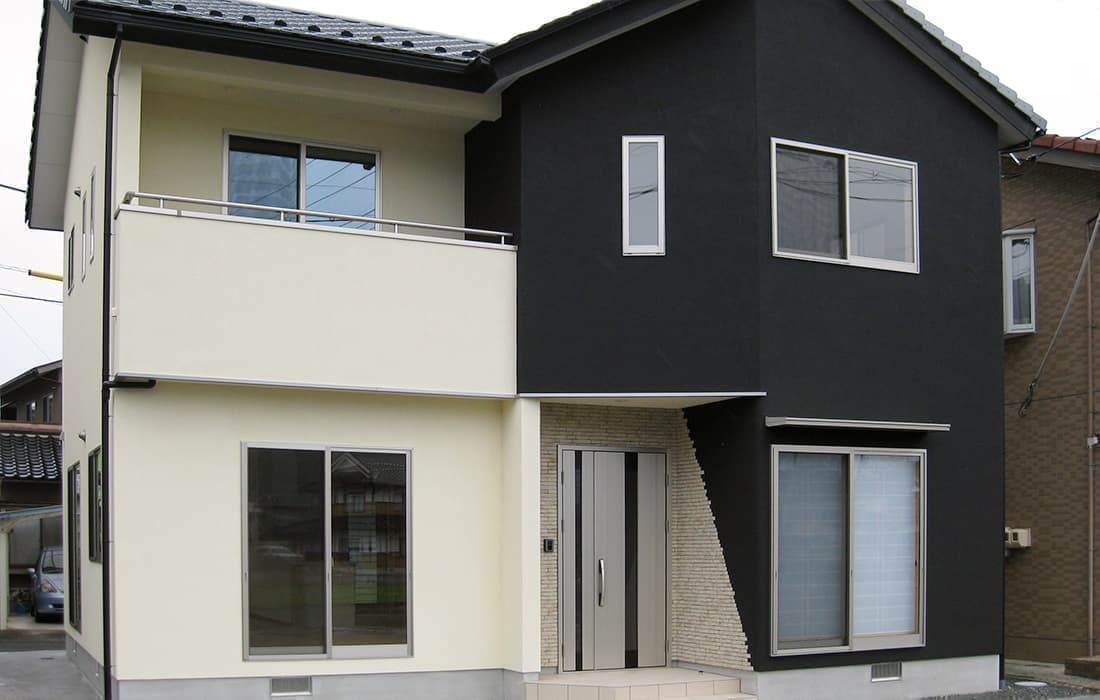 「木組みの家」洋風モダン住宅 ブラックが映えるモノトーンの家 新築 ブラックの外壁と玄関のタイルがモダンな佇まい。玄関扉の上には斜めにした壁をデザインしています。対面キッチンは家族を感じながら作業ができて魅力的です。土地を最大限に利用しできるだけ広く使えるように設計しました。 前へ 建築実例一覧 次へ