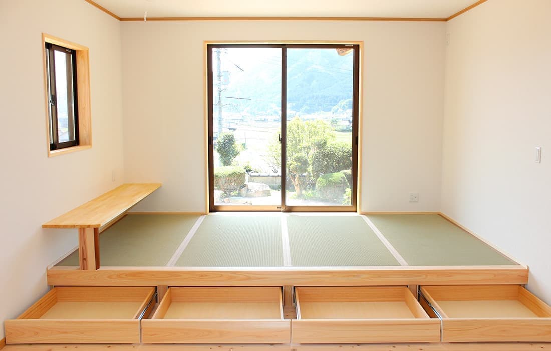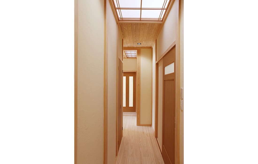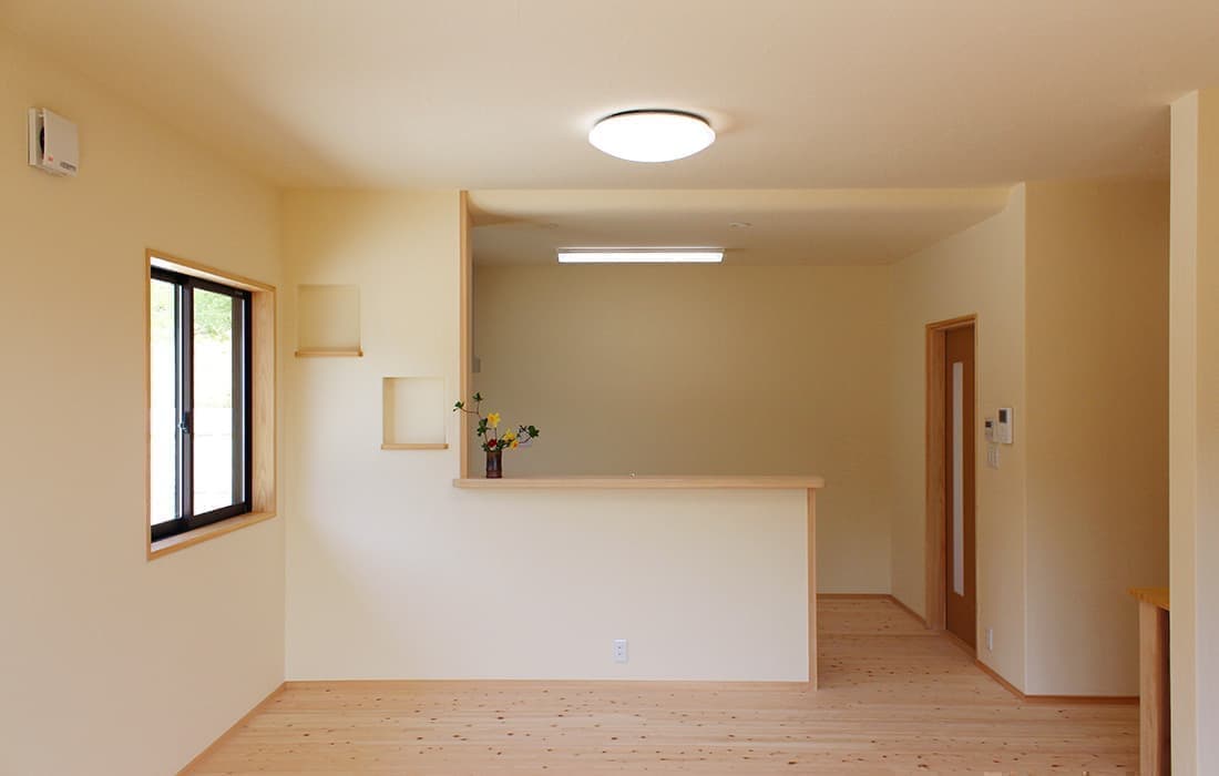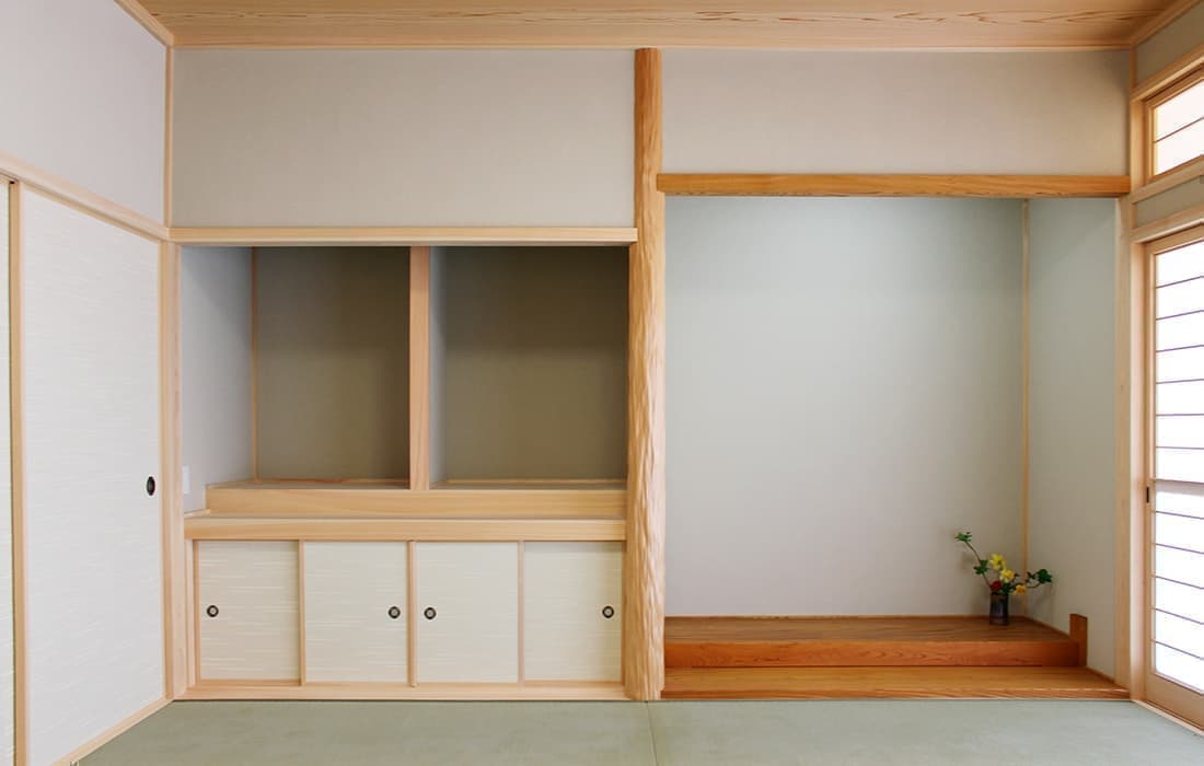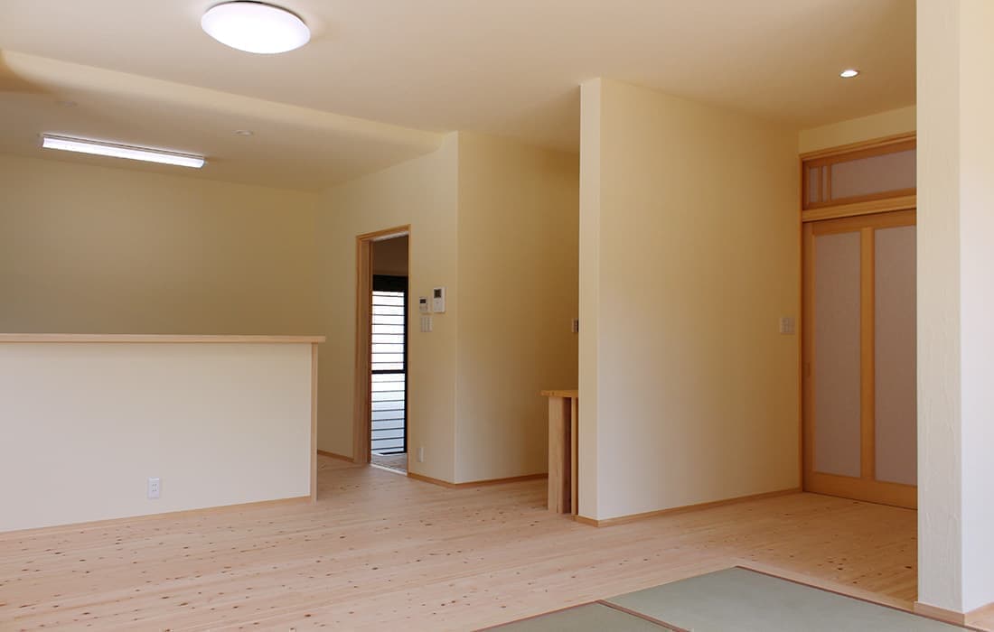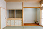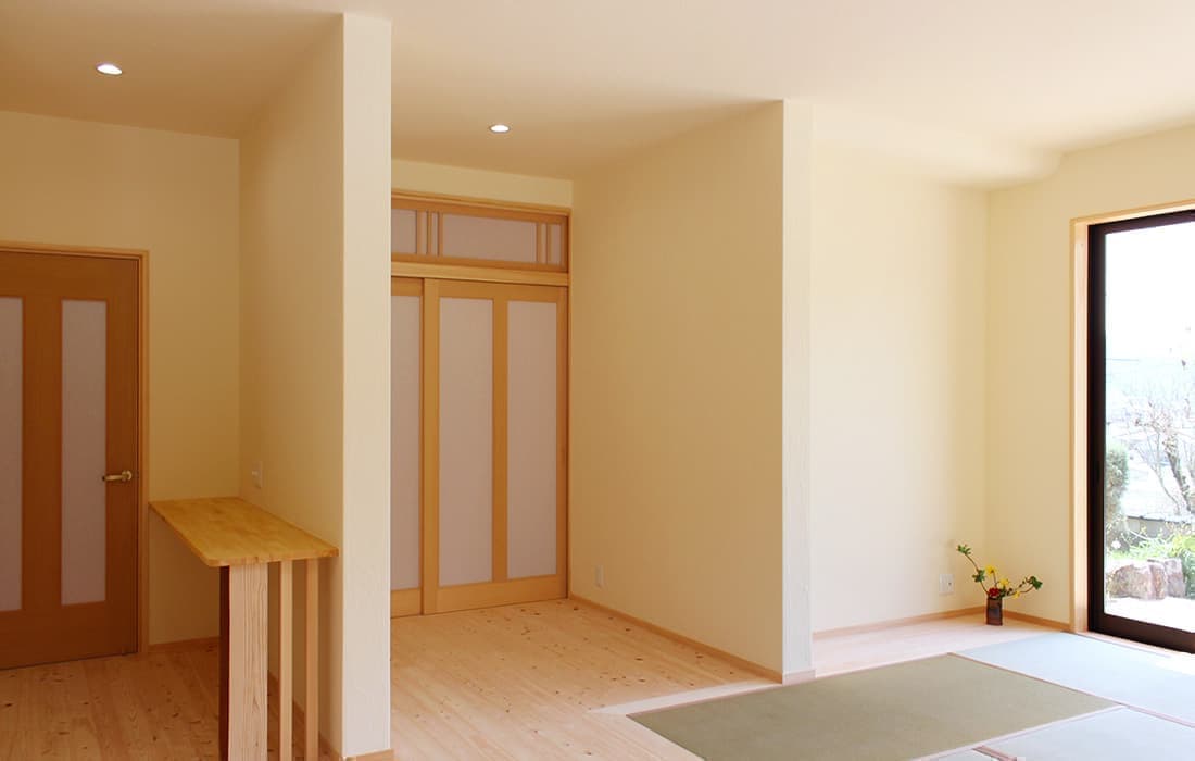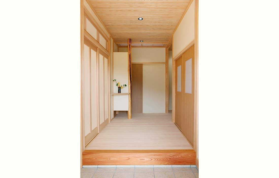 「木組みの家」純和風住宅 自然と和 共に暮らす平屋の家 新築 桧の板貼り、格子の玄関が美しい平屋の住まいです。存在感のある柱と飾り棚のある玄関ホール。LDKの壁は調湿効果のある珪藻土を使用。寝室は小上がりした畳コーナーの下に収納スペースをつくりました。家族がつながる、居心地の良い住まいが心を癒してくれます。 前へ 建築実例一覧 次へ