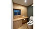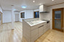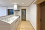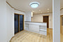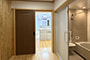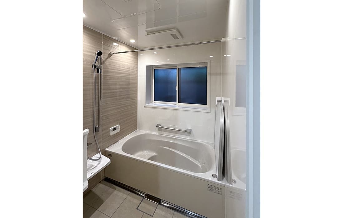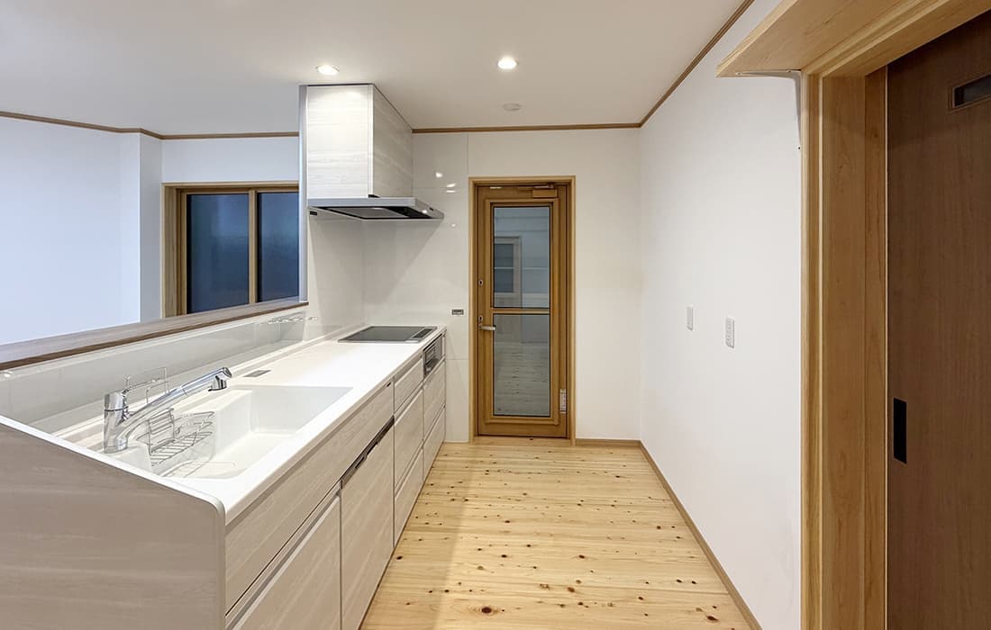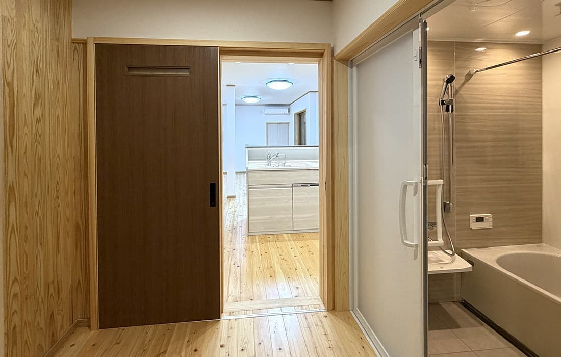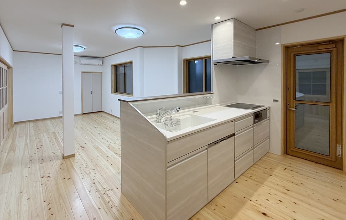 リビングと台所がそれぞれ独立していた間取りを見直し、一体化。開放感あふれる、広々としたLDKへと生まれ変わりました。施工前は壁付けだったキッチンを、対面キッチンへ変更。動線がスムーズになり、使い勝手はもちろん、デザイン性や収納力も向上しています。また、一部にあった出っ張り部分は、柱を抜いてしっかりと補強し、斜めの壁を設けることで、空間を有効活用。広く、より使いやすいレイアウトを実現しました。建具には無垢材を使用し、空間全体の雰囲気もやさしく一新。トイレのカウンターには桧の無垢材を採用し、色分けを施すことで、落ち着きのある心地よい空間に仕上げています。