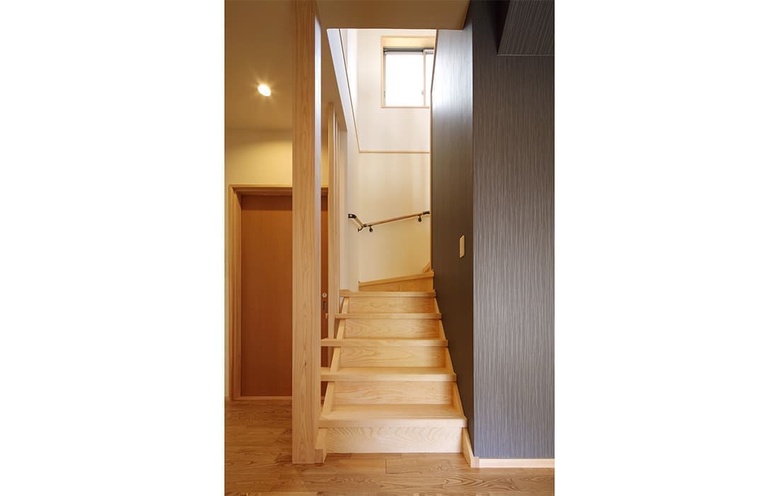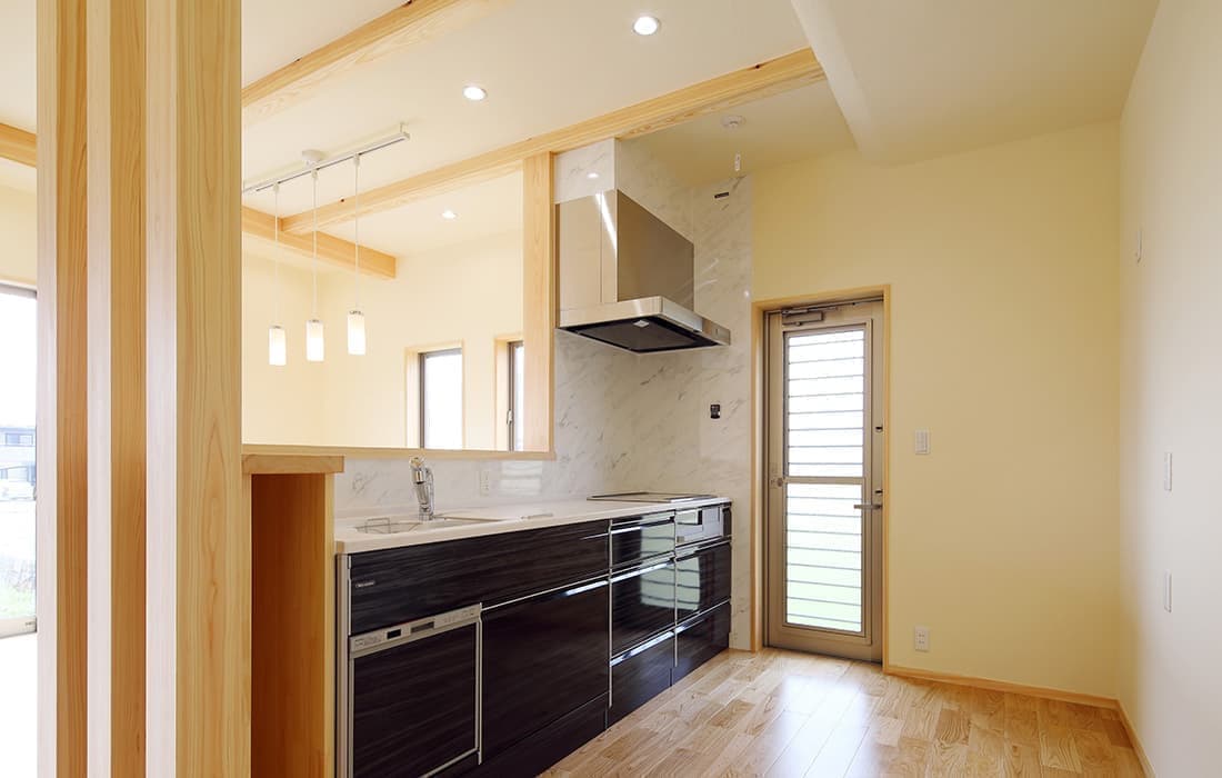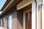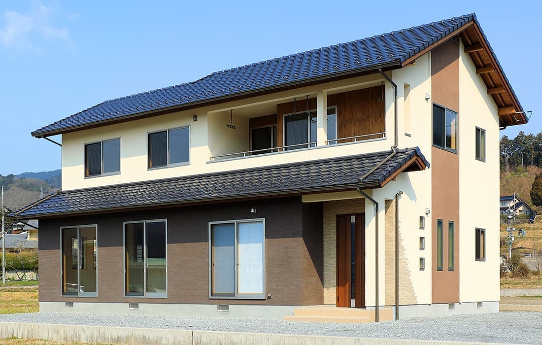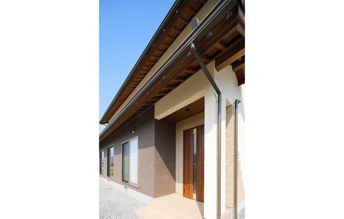 「木組みの家」洋風モダン住宅 リビングのR壁が魅力的な家 新築 ブラウンの外壁と玄関のタイルがモダンな外観です。玄関には土間収納スペースがあり、掃除用品もすっきり収納できます。框にはケヤキ材(銘木)で、柱にはすべて桧の4寸角(無垢)を使用。LDKは19帖と広々しています。リビングのR壁が魅力的でキッチンから洗面・浴室と繋がり家事動線も短くなるように考えています。リビングからつながる和室はたくさんのお客様にも対応できます。小屋裏収納や夫婦寝室の横にはWクローゼットで収納力抜群です。 前へ 建築実例一覧 次へ
