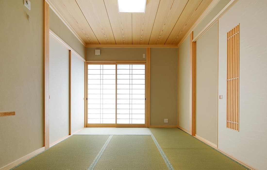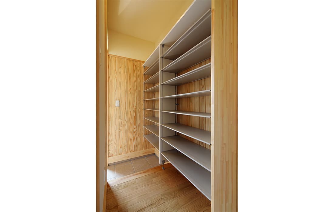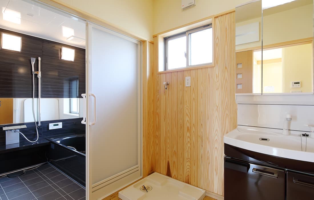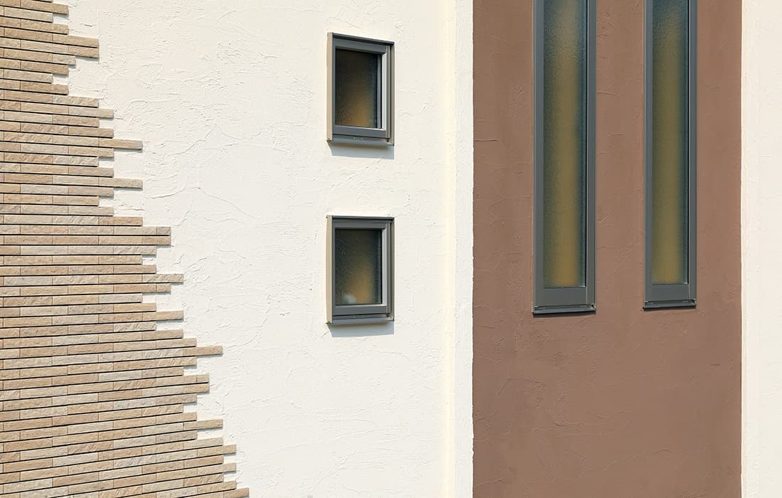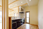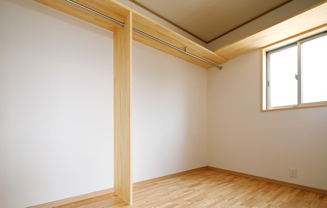 「木組みの家」洋風モダン住宅 リビングのR壁が魅力的な家 新築 ブラウンの外壁と玄関のタイルがモダンな外観です。玄関には土間収納スペースがあり、掃除用品もすっきり収納できます。框にはケヤキ材(銘木)で、柱にはすべて桧の4寸角(無垢)を使用。LDKは19帖と広々しています。リビングのR壁が魅力的でキッチンから洗面・浴室と繋がり家事動線も短くなるように考えています。リビングからつながる和室はたくさんのお客様にも対応できます。小屋裏収納や夫婦寝室の横にはWクローゼットで収納力抜群です。 前へ 建築実例一覧 次へ
