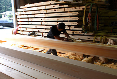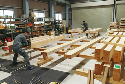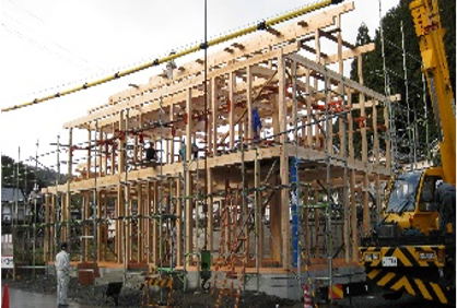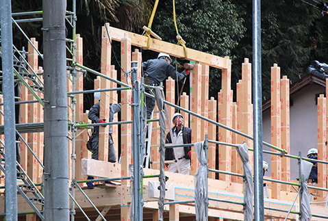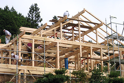 いよいよ棟上げです。早朝から大きなレッカー車がきて大工職人達がたくさん集まり、手慣れた職人達でも現場では緊張感が伝わります。土台だけの状態から柱を立てたりカケヤで組み上げていきます。車知栓継ぎ(しゃちせんつぎ)・金輪継ぎ(かなわつぎ)・蟻組み(ありぐみ)と職人の技も光ります。この日の為に作業場で丁寧に手刻みした材料が実際正確に組み上がる気持ちよさここに大工の喜びと達成感を味わう瞬間。当日で家の骨組みが出来上がり、建物の形が現れとても感動的です。棟上げ後は、当社とお施主様で上棟式を行います。土地や建築を司る神様に感謝し、工事の安全と建物が末永く丈夫でありますようにとお祈りして安全祈願とお清めをします。お餅やお菓子投げもできます。