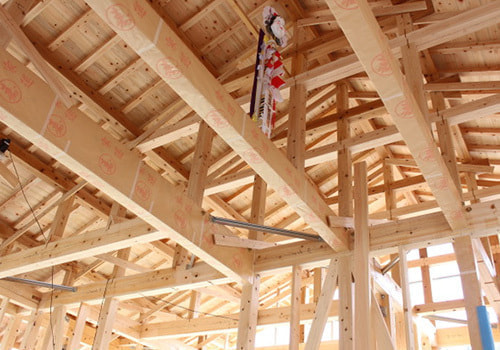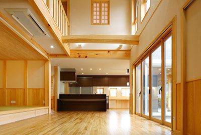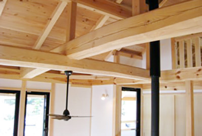 木組みの家は釘や金物にたよらず木と木を組むことで高い耐久性を得られ、ダイナミックに梁を交差させたり骨組みを見せる工法。当社は手刻みによる「木組みの家」にもこだわります。木の心を読み、技で組み上げる。プレカット材に頼らず大工職人の手によって柱や梁を手刻みしたものを現場で組み上げます。昔ながらの「木組みの家」は自然木の美しさと力強さを感じることができる魅力がいっぱいです。木を生かす家づくりをしていきます。