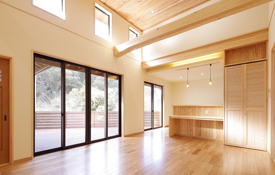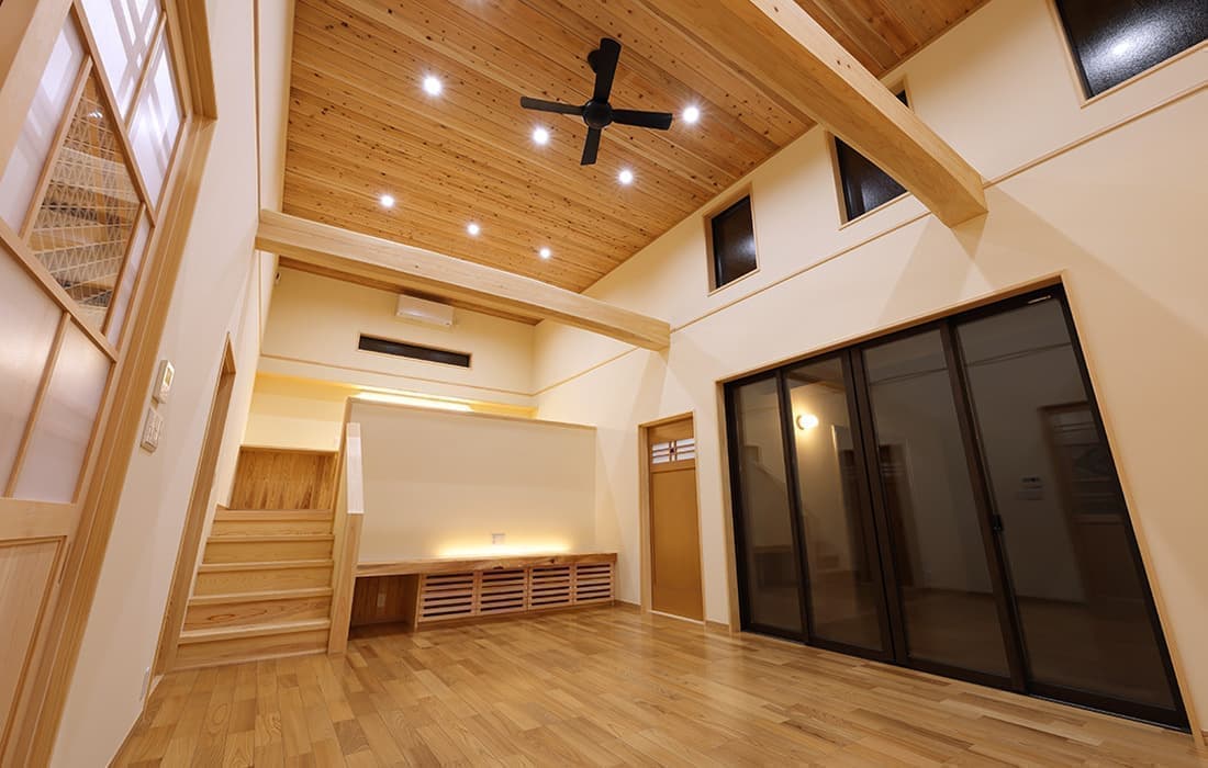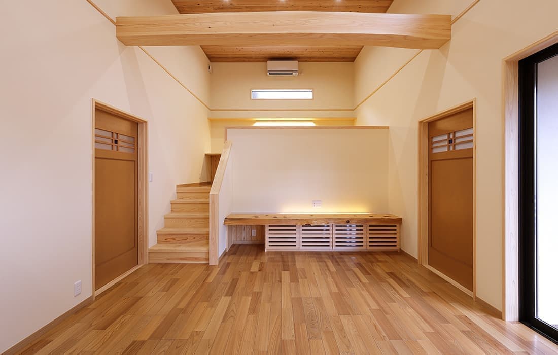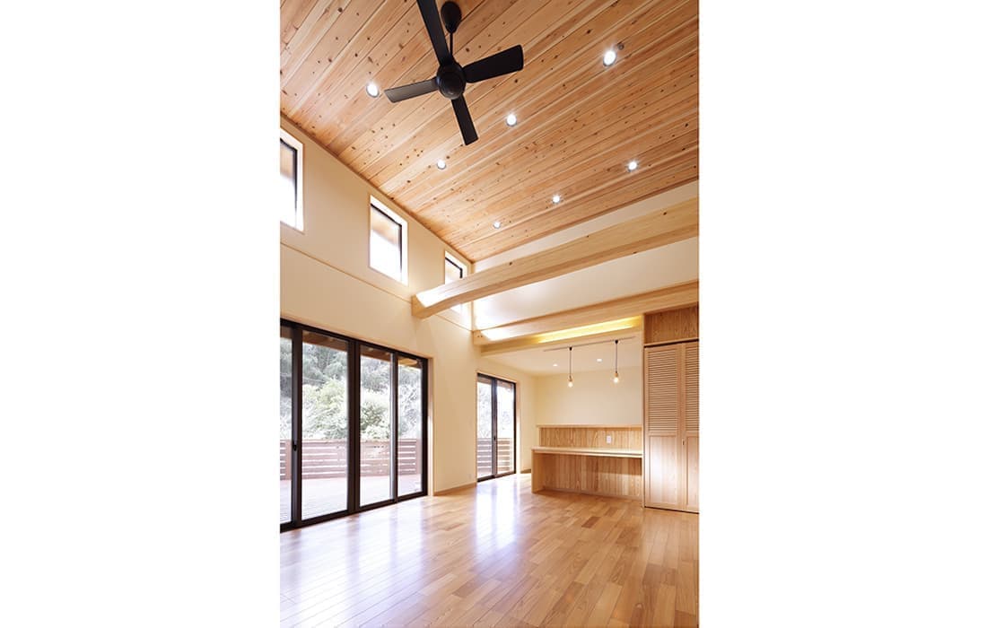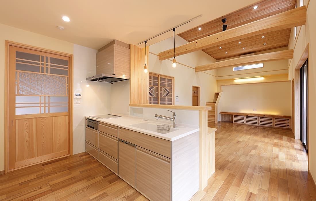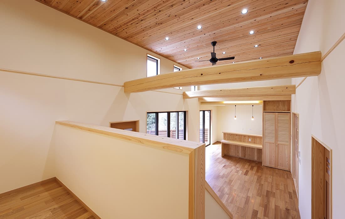 杉板張りにネイビーの外壁がアクセントになった外観。スキップフロアのある平屋の家です。存在感のある桧のタイコ梁がダイナミックで美しい空間のLDK。天井高は4m。高い天井だからこそできる4帖半のスキップフロアの書斎には横幅4mの机がありワークスペースも充実しています。プライベート感がありながら、家族の気配を感じることができます。遊び心のある空間にできるのもスキップフロアの魅力です。玄関にはスッキリと片付くシューズクロークを完備。組子細工をあしらった建具が木の温かみと繊細な模様で和モダンな雰囲気を演出してくれます。LDK・子供部屋・脱衣場からは共有のウッドデッキにつながり家事動線が楽になる設計。開放感のあるウッドデッキでは休日にBBQやガーデニングなど様々な楽しみ方ができます。家にいながら自然を感じることができる住まいです。