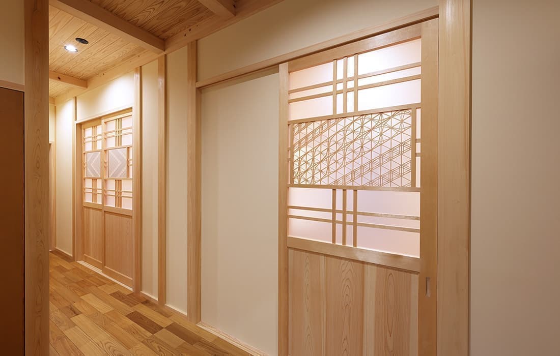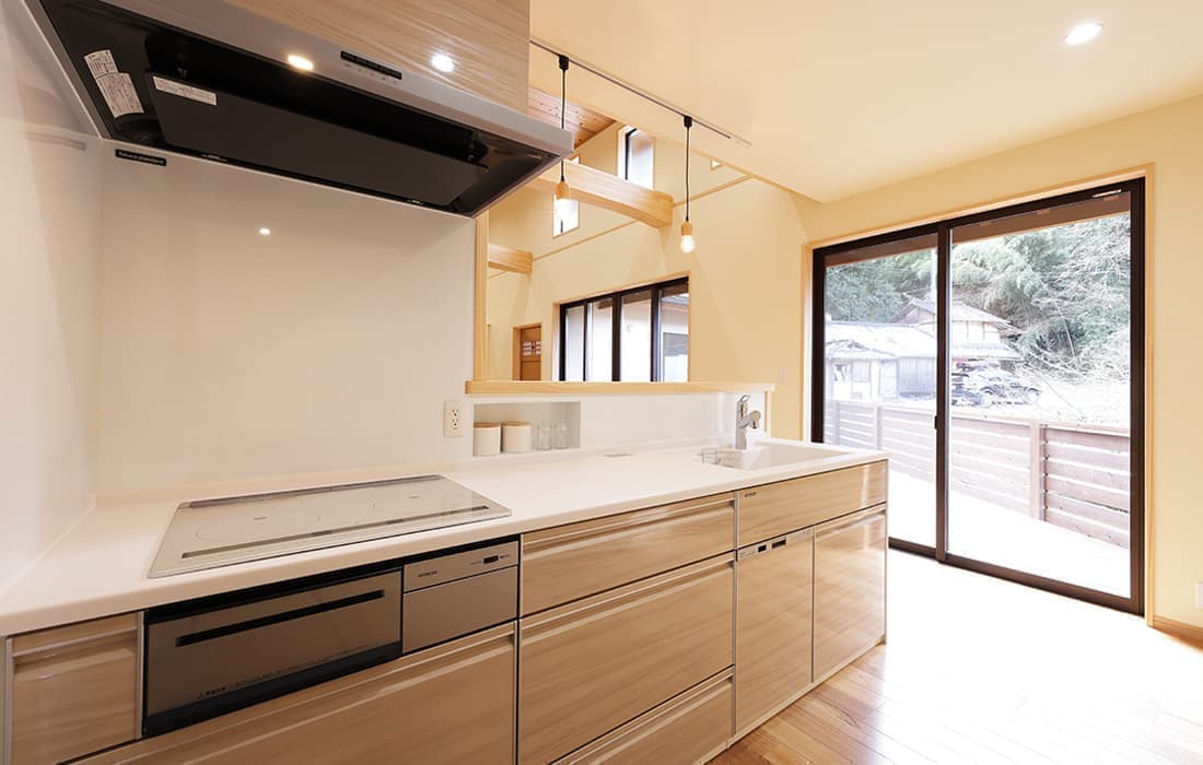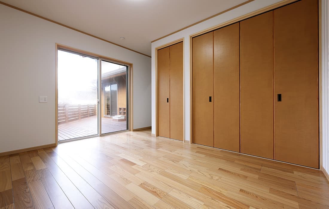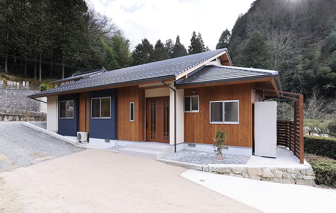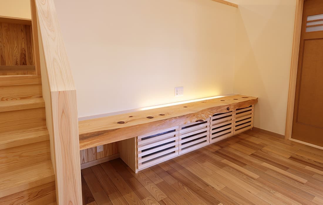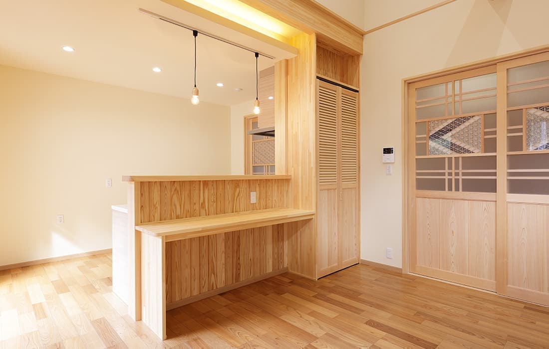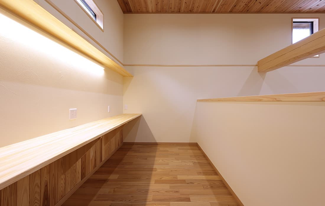 杉板張りにネイビーの外壁がアクセントになった外観。スキップフロアのある平屋の家です。存在感のある桧のタイコ梁がダイナミックで美しい空間のLDK。天井高は4m。高い天井だからこそできる4帖半のスキップフロアの書斎には横幅4mの机がありワークスペースも充実しています。プライベート感がありながら、家族の気配を感じることができます。遊び心のある空間にできるのもスキップフロアの魅力です。玄関にはスッキリと片付くシューズクロークを完備。組子細工をあしらった建具が木の温かみと繊細な模様で和モダンな雰囲気を演出してくれます。LDK・子供部屋・脱衣場からは共有のウッドデッキにつながり家事動線が楽になる設計。開放感のあるウッドデッキでは休日にBBQやガーデニングなど様々な楽しみ方ができます。家にいながら自然を感じることができる住まいです。