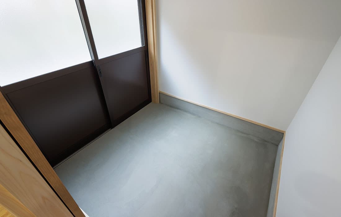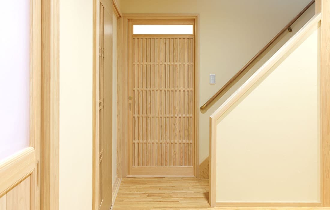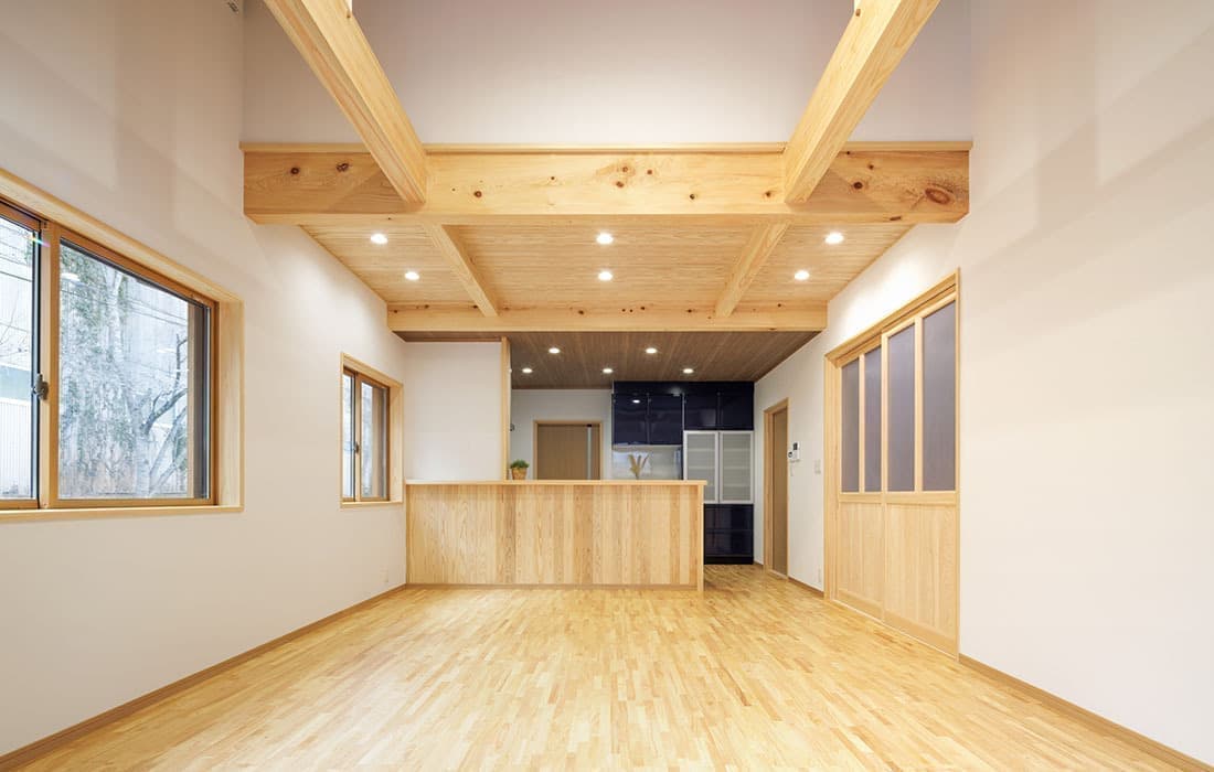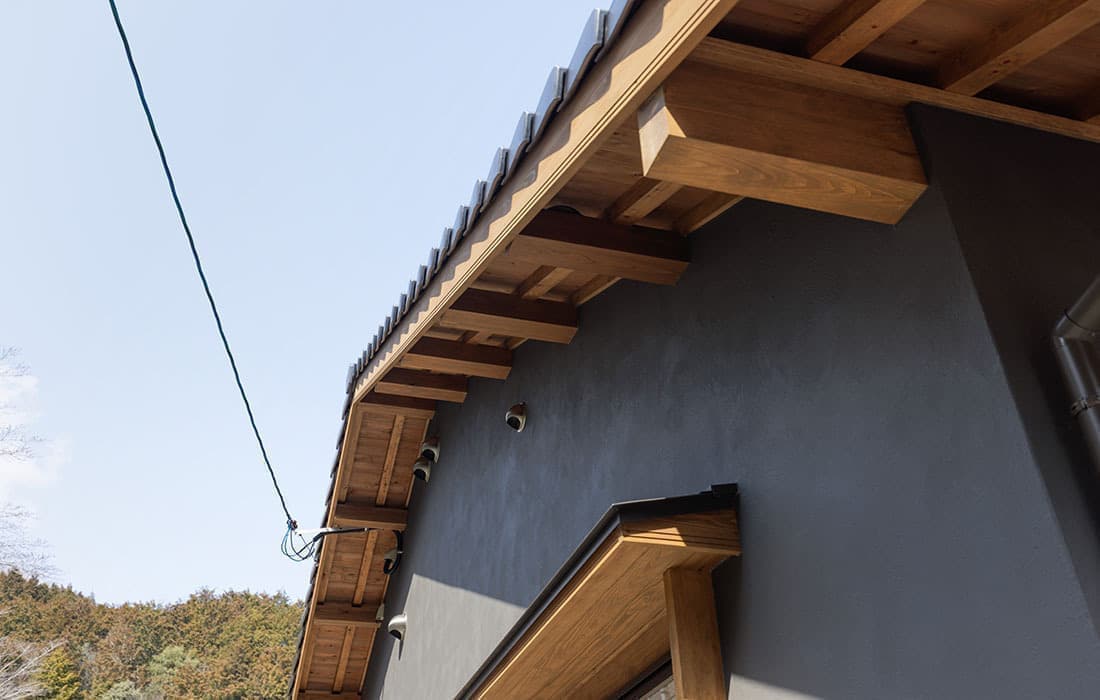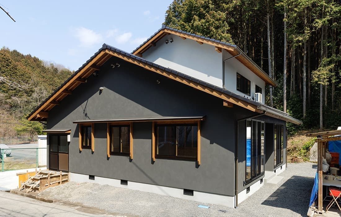 四季折々の緑に彩られた中に溶け込むような外観。外壁はジョリパット塗りで職人のコテ仕上げの家です。軒下、窓の飾りは外壁のアクセントになり自然な風合いが特徴です。リビングは杉板張りの勾配天井が縦の広がりを強調。吹き抜けの大空間の中に桧材の化粧梁。開放感にあふれたリビングを実現しています。玄関と水廻りの壁には珪藻土を使用。珪藻土の質感が際立ち自然素材の優しい印象に仕上げています。和室は職人の手仕事による真壁・ジュラク塗りが本格和風住宅の良さを引き出しています。障子からは優しい光が入り、国産いぐさの香りに包まれた落ち着きのある空間に。縁側もあり季節の草花を眺めてゆったりとした時間を過ごせる心地よい住まいです。