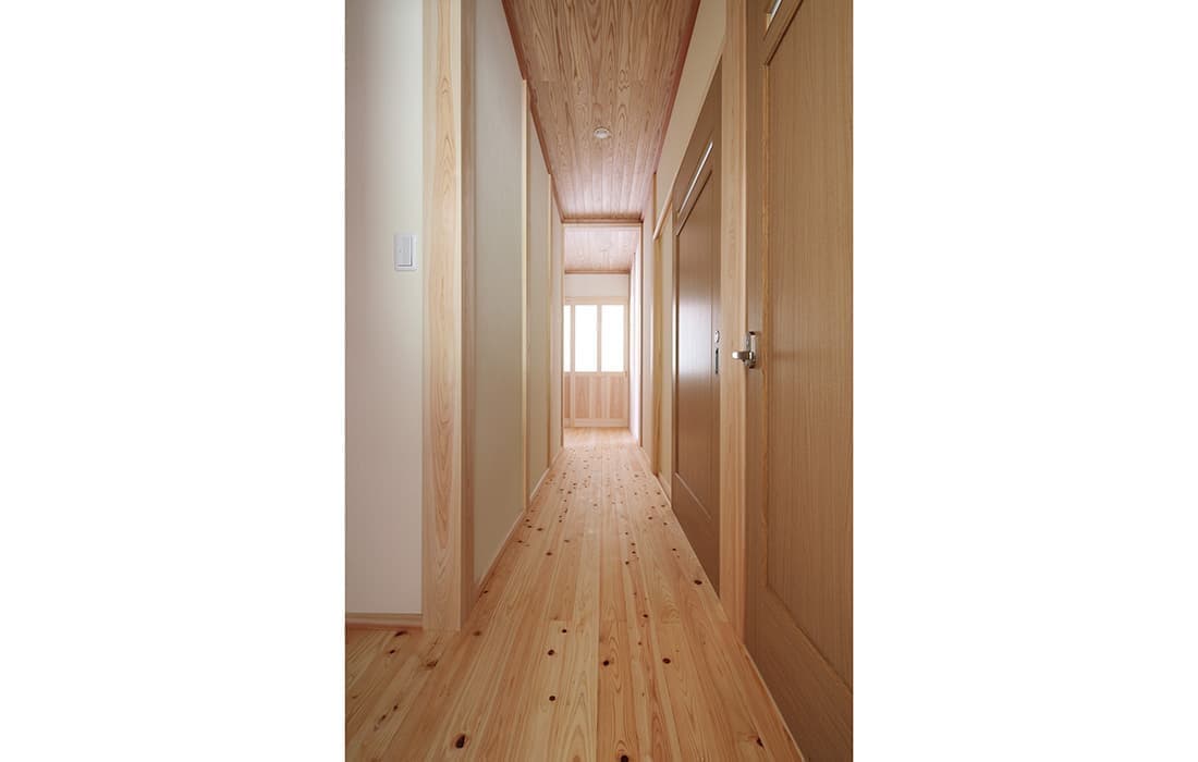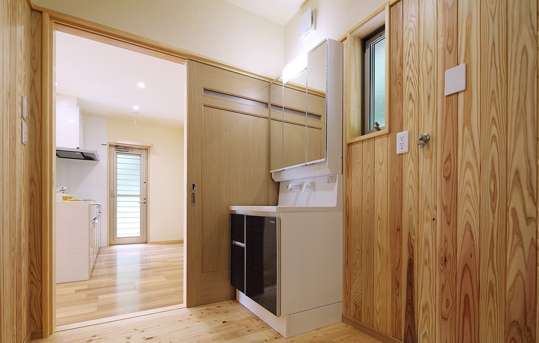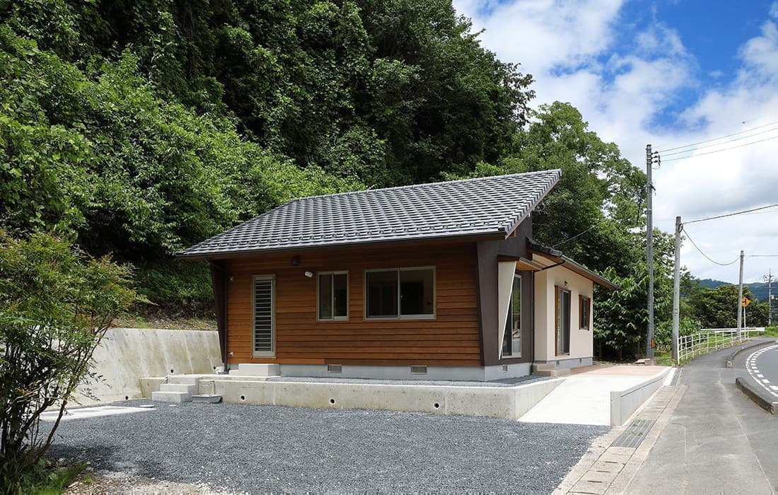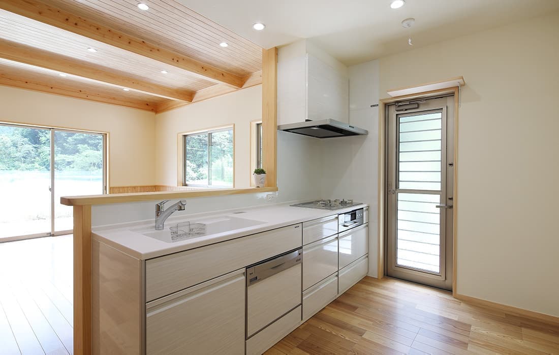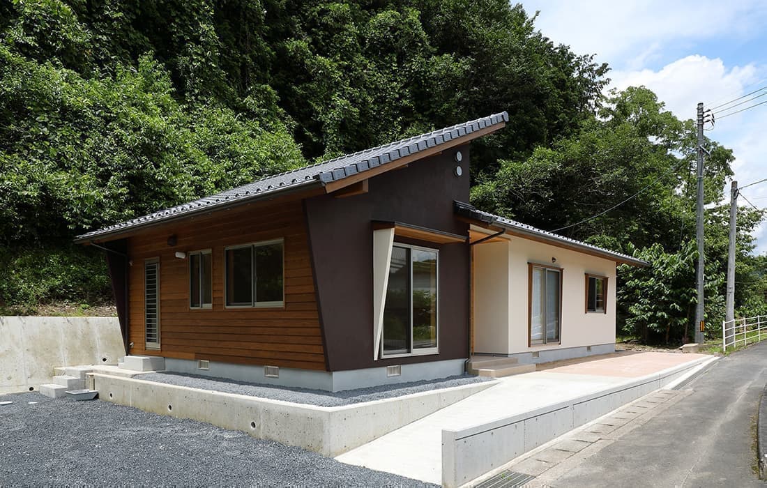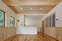 「木組みの家」洋風モダン住宅 wood×斜め壁 平屋の家 新築 切り妻屋根に杉の板貼りが目を引く外観。外壁に変化をつけるため斜め壁にしてデザインしています。窓にも木枠を斜めにして同じデザインで統一感をプラス。濃茶、白、木の色合いで3色に彩った外観が印象的な平屋です。LDKは高い天井で開放的にし、キッチンから洗面所、浴室と繋がり生活動線を考えた間取りになっています。家族の気配を感じながらリビングはいつもみんなが集まる癒しの場所です。 前へ 建築実例一覧 次へ