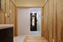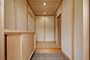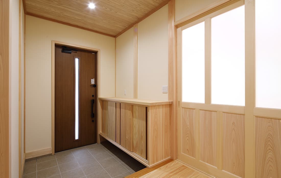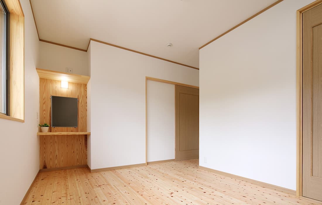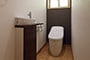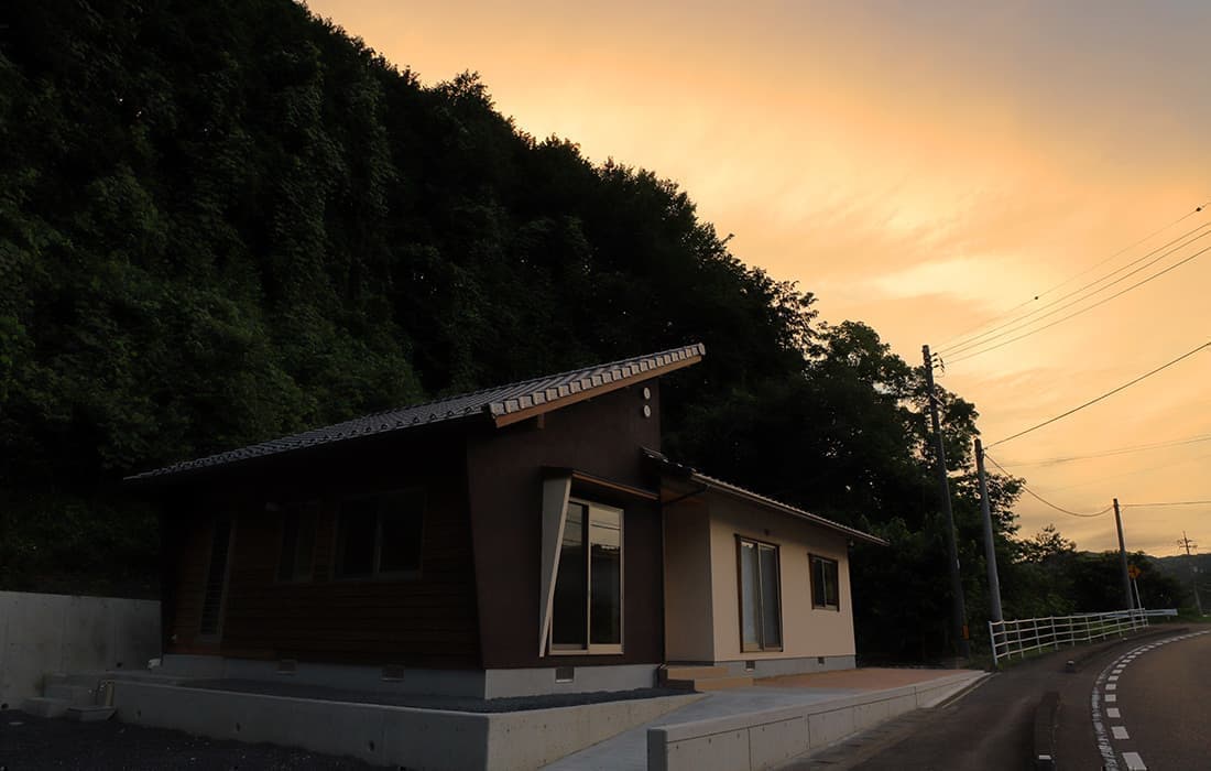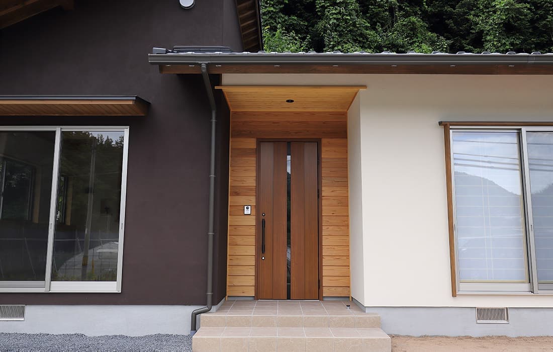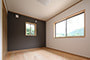 「木組みの家」洋風モダン住宅 wood×斜め壁 平屋の家 新築 切り妻屋根に杉の板貼りが目を引く外観。外壁に変化をつけるため斜め壁にしてデザインしています。窓にも木枠を斜めにして同じデザインで統一感をプラス。濃茶、白、木の色合いで3色に彩った外観が印象的な平屋です。LDKは高い天井で開放的にし、キッチンから洗面所、浴室と繋がり生活動線を考えた間取りになっています。家族の気配を感じながらリビングはいつもみんなが集まる癒しの場所です。 前へ 建築実例一覧 次へ