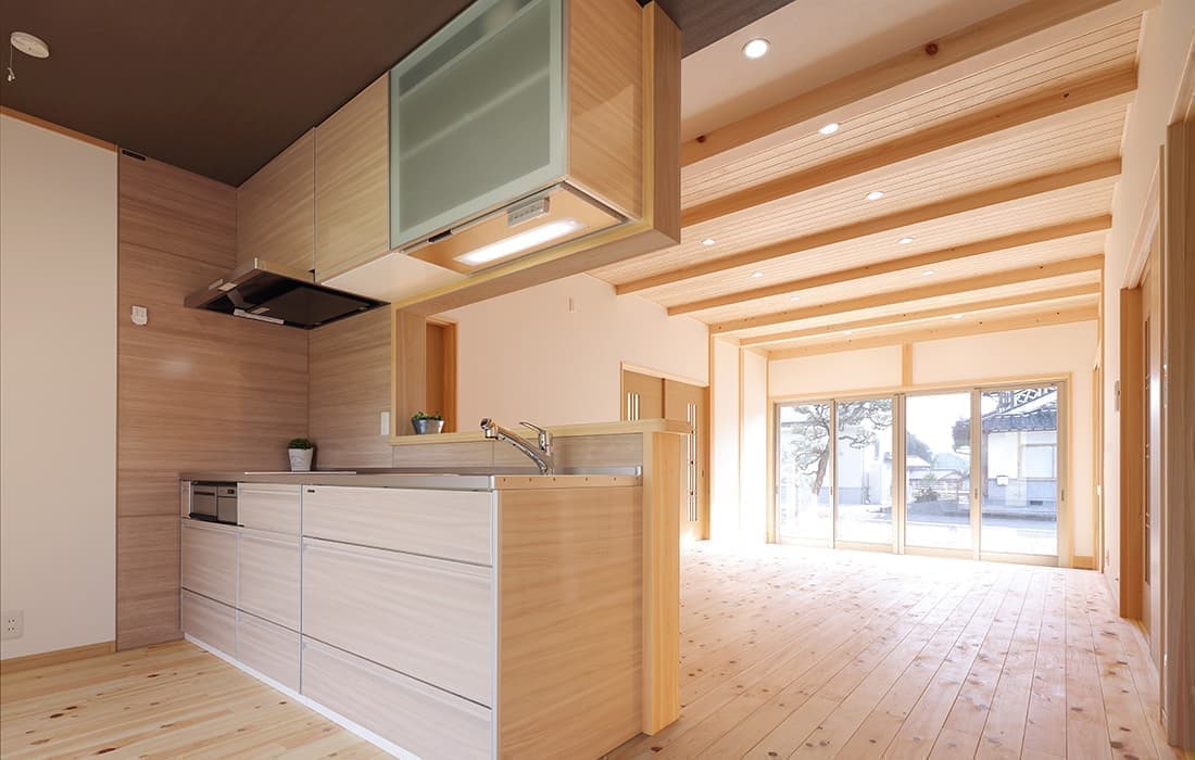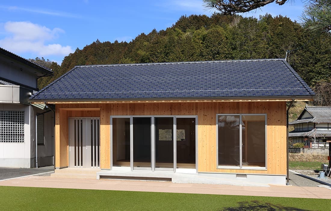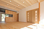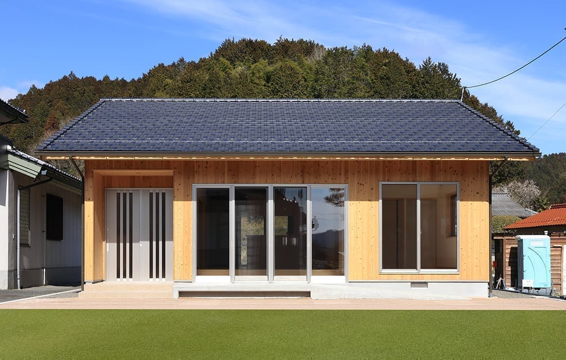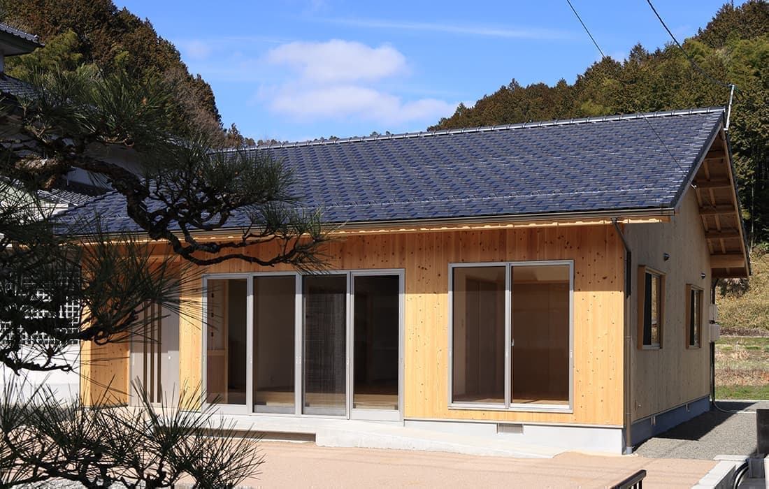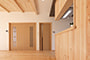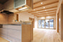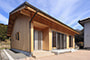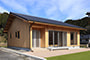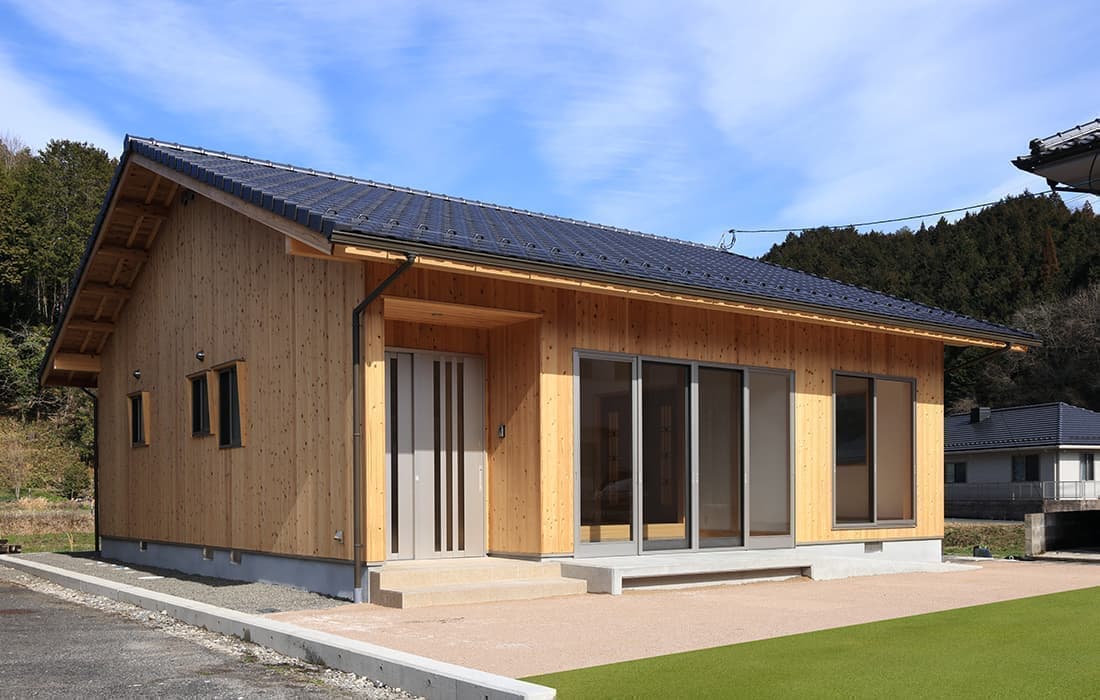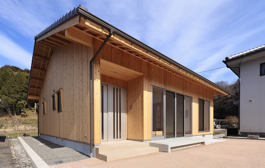 「木組みの家」洋風モダン住宅 杉板貼り平屋の家 新築 外壁を全面杉板貼りにし、木目と節が天然木ならではの奥深い味わいになり魅力的な平屋です。日差しが心地よい土間テラスはリビングとつながり一体感があり広々としています。来客時には、テラスでくつろぎのカフェタイム。リビングの天井も高くし、梁を出し杉板貼りにして開放感のある空間になっています。対面式のキッチンの壁面やフローリングは「ひのき」を使用して温かい雰囲気に。部屋の入口は引き戸を採用し、すべての動線を短くコンパクトにしています。スローライフを楽しむ一人暮らし癒しの住まいです。 前へ 建築実例一覧 次へ