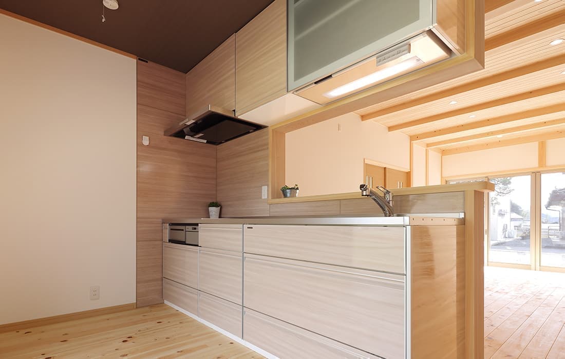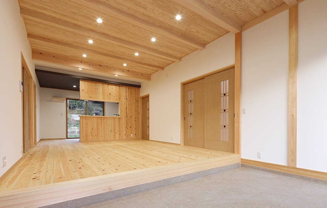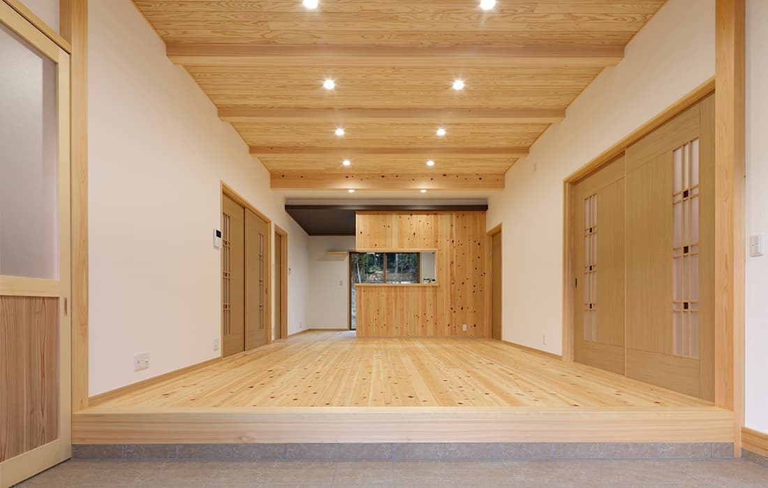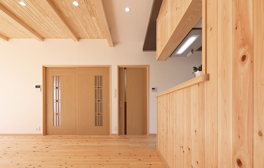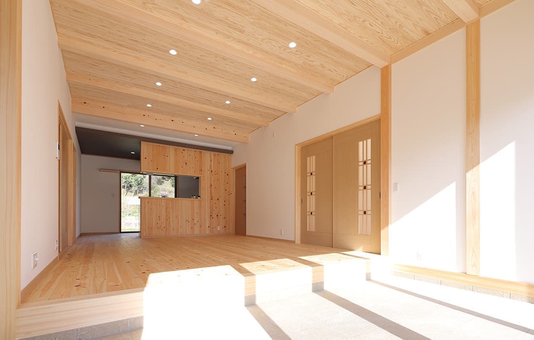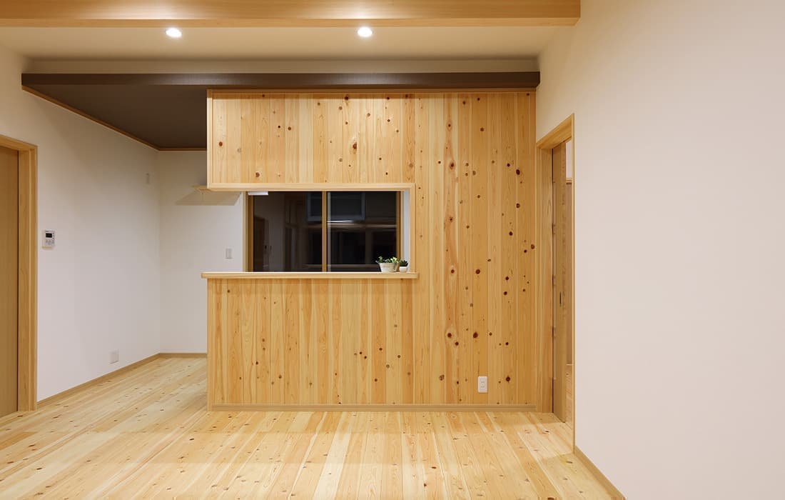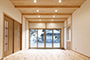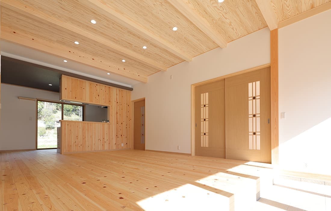 「木組みの家」洋風モダン住宅 杉板貼り平屋の家 新築 外壁を全面杉板貼りにし、木目と節が天然木ならではの奥深い味わいになり魅力的な平屋です。日差しが心地よい土間テラスはリビングとつながり一体感があり広々としています。来客時には、テラスでくつろぎのカフェタイム。リビングの天井も高くし、梁を出し杉板貼りにして開放感のある空間になっています。対面式のキッチンの壁面やフローリングは「ひのき」を使用して温かい雰囲気に。部屋の入口は引き戸を採用し、すべての動線を短くコンパクトにしています。スローライフを楽しむ一人暮らし癒しの住まいです。 前へ 建築実例一覧 次へ