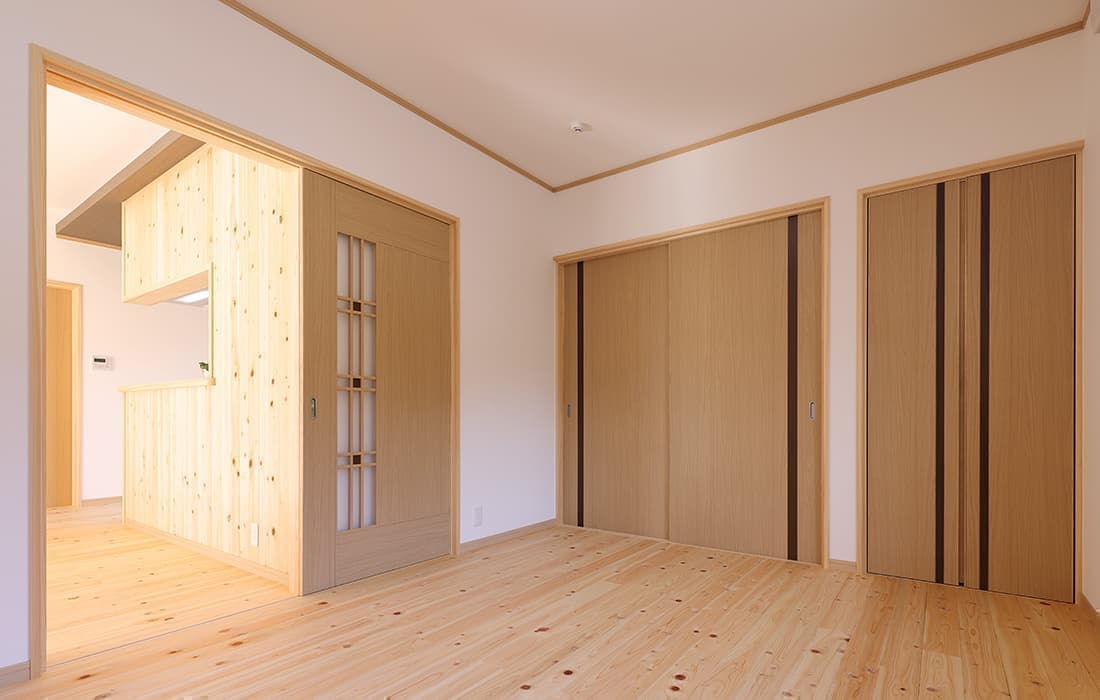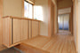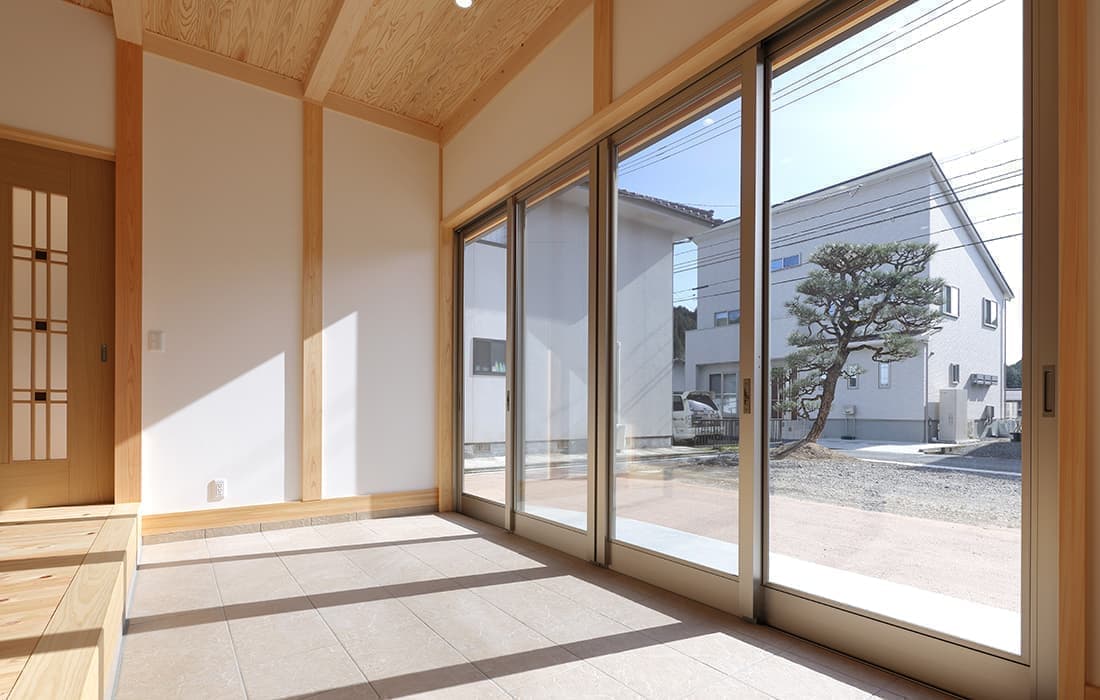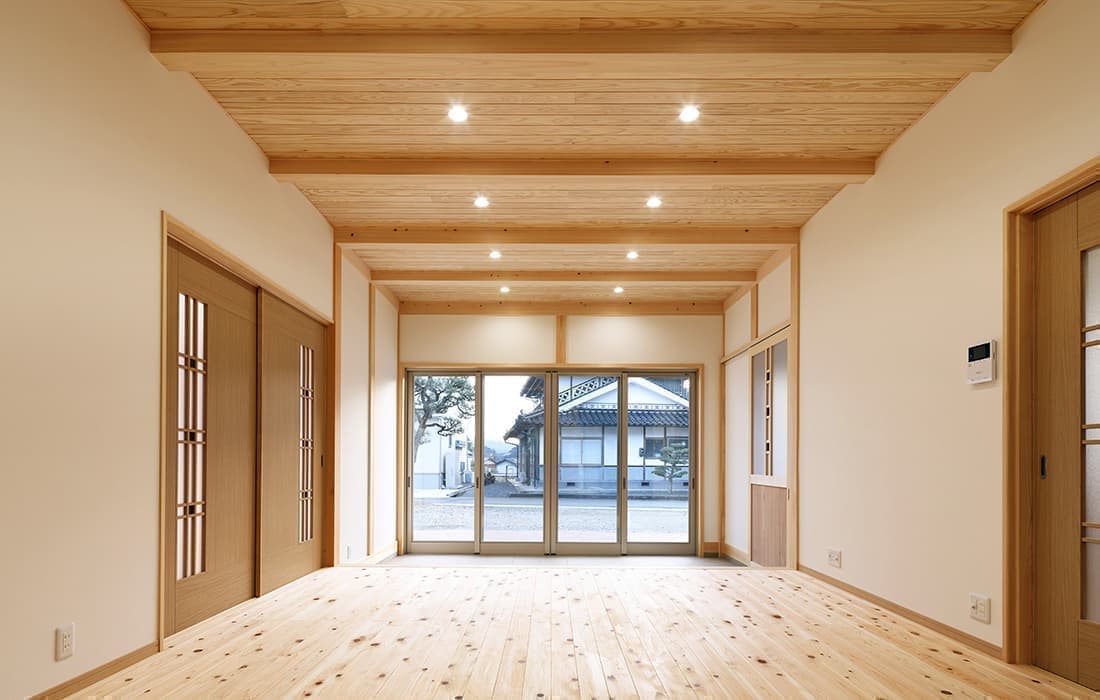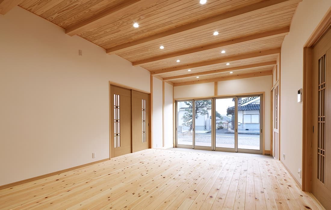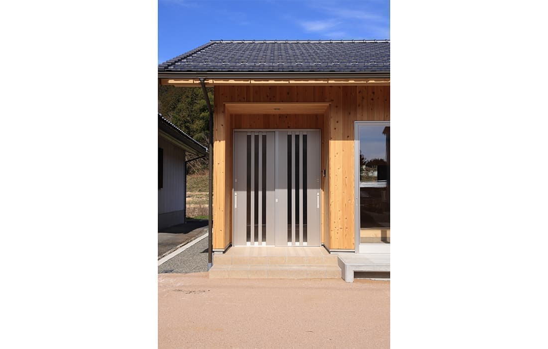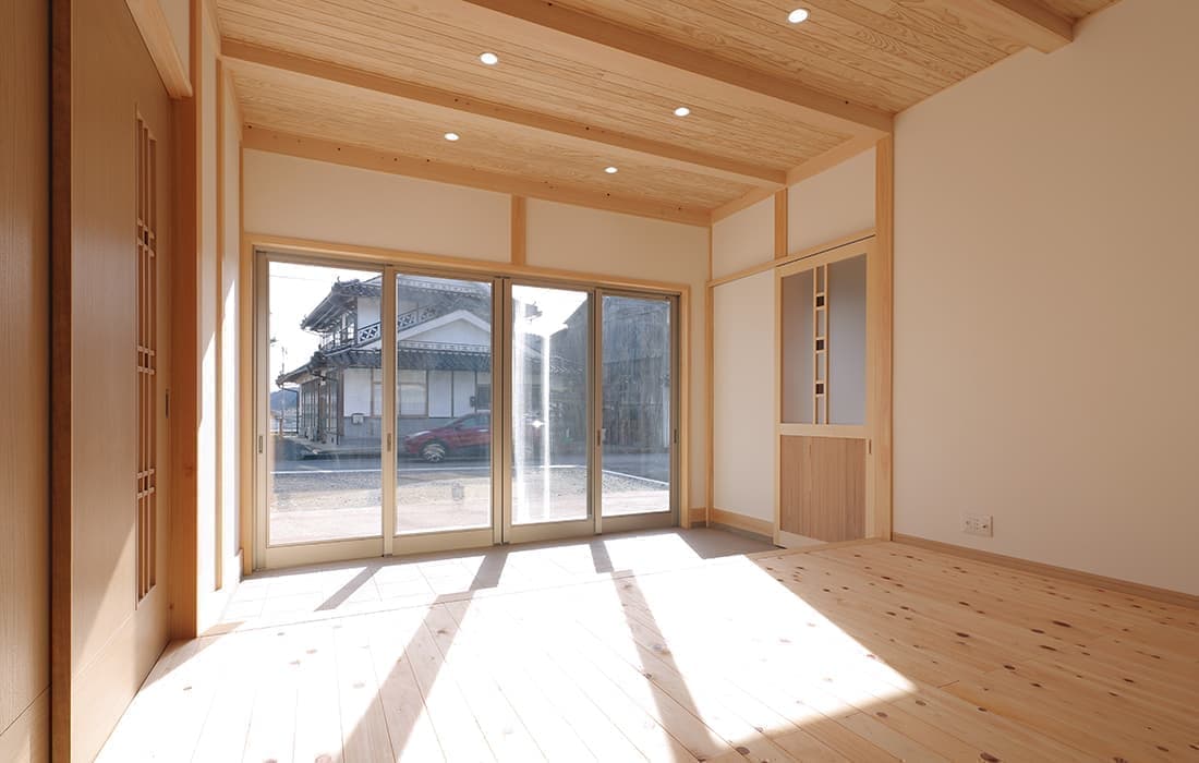 「木組みの家」洋風モダン住宅 杉板貼り平屋の家 新築 外壁を全面杉板貼りにし、木目と節が天然木ならではの奥深い味わいになり魅力的な平屋です。日差しが心地よい土間テラスはリビングとつながり一体感があり広々としています。来客時には、テラスでくつろぎのカフェタイム。リビングの天井も高くし、梁を出し杉板貼りにして開放感のある空間になっています。対面式のキッチンの壁面やフローリングは「ひのき」を使用して温かい雰囲気に。部屋の入口は引き戸を採用し、すべての動線を短くコンパクトにしています。スローライフを楽しむ一人暮らし癒しの住まいです。 前へ 建築実例一覧 次へ