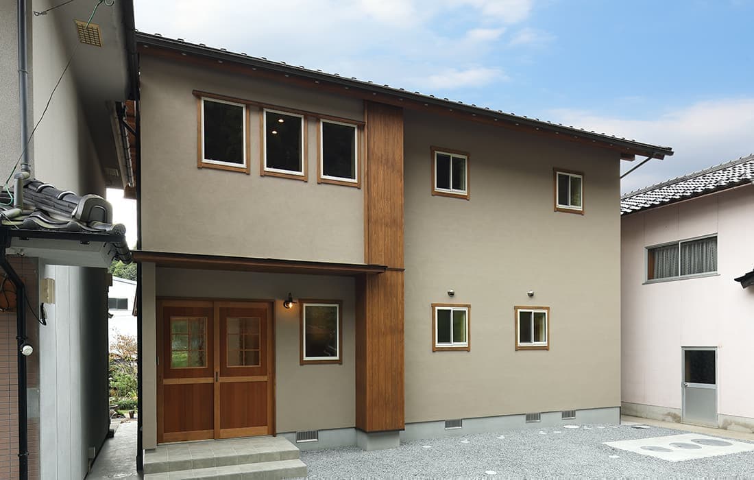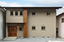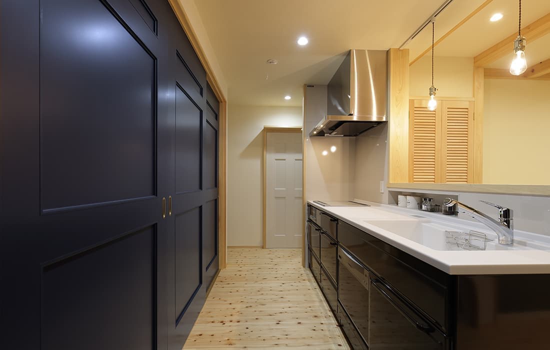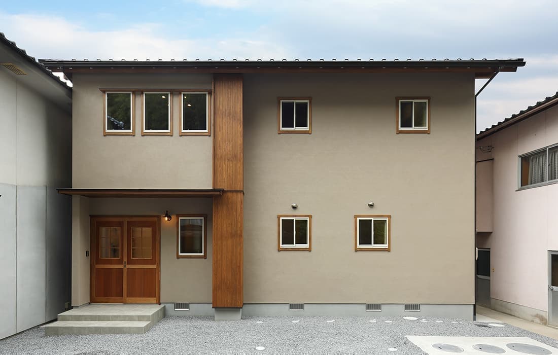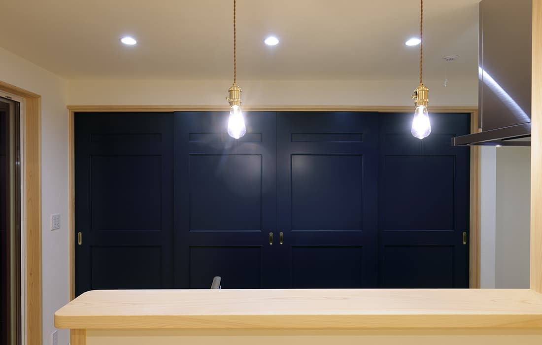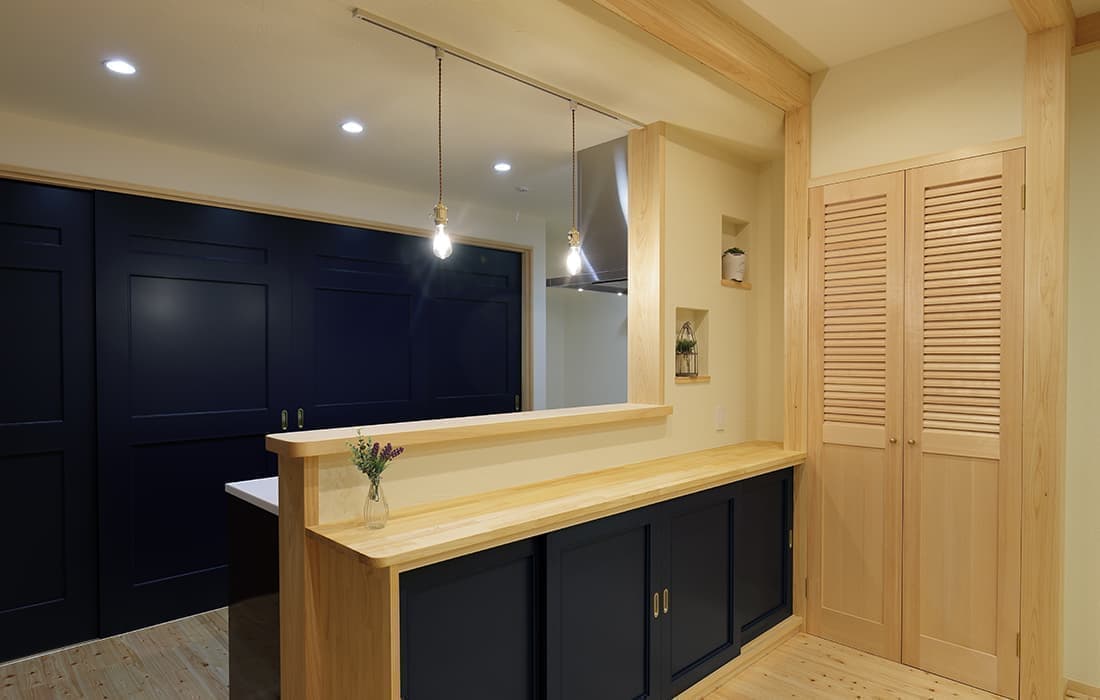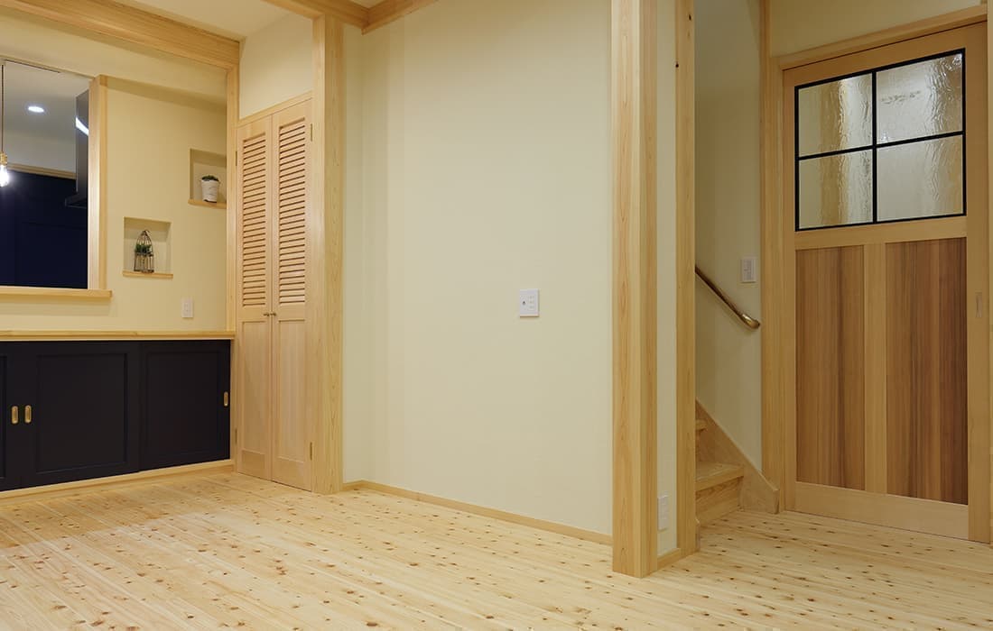日本家屋の玄関にある土間。もともとは家に上がる為のスペースであった土間が近年では家全体の印象をつける場所となります。土間のスペースを広くとり、おしゃれな空間を演出する場所。薪ストーブを置ける場所。コミュニケーションの場として多様な使い方が出来ます。内部には県産材をたくさん使い構造材、柱、フローリング全てに至るまで無垢のヒノキ材を使用しています。土間とつながるLDKは、尾引天井で空間を広くし珪藻土の柔らかみとネイビーの建具でアクセントのある雰囲気に。リビングに入る建具にはアンティークガラスと黒のアイアンでおしゃれに演出。随所に真鍮をあしらい細部までこだわり。優しい色合いの自然素材を基調としたナチュラルな外観。杉板の柱と木の縁取りをした窓枠、玄関ドアもオリジナル木製建具で柔らかい印象に。
