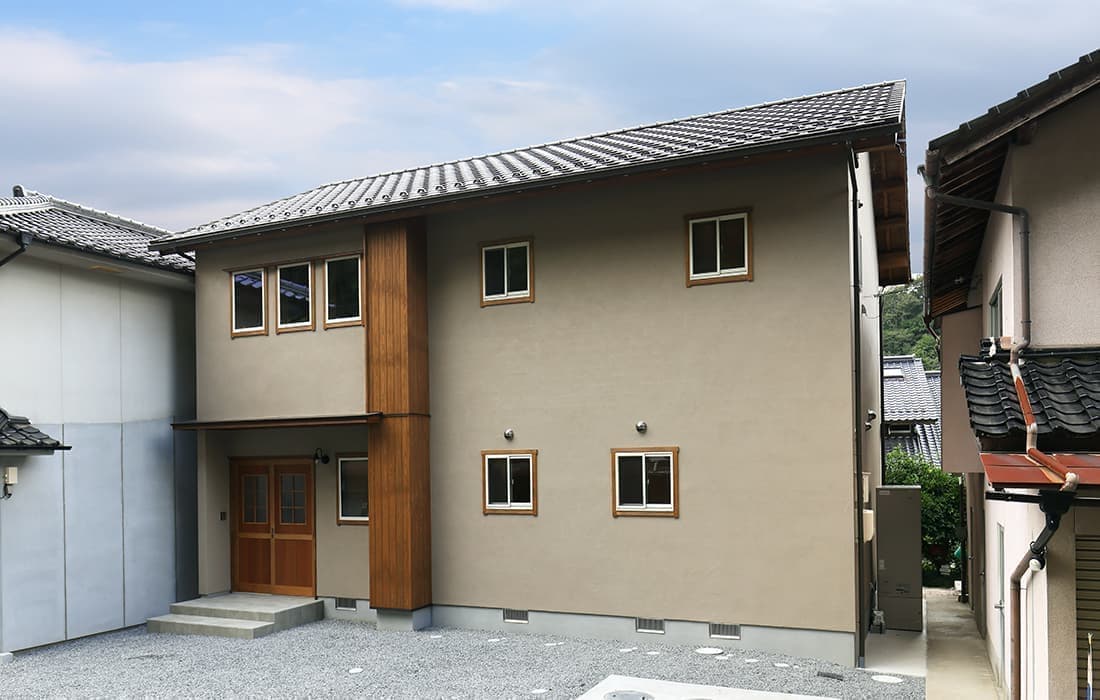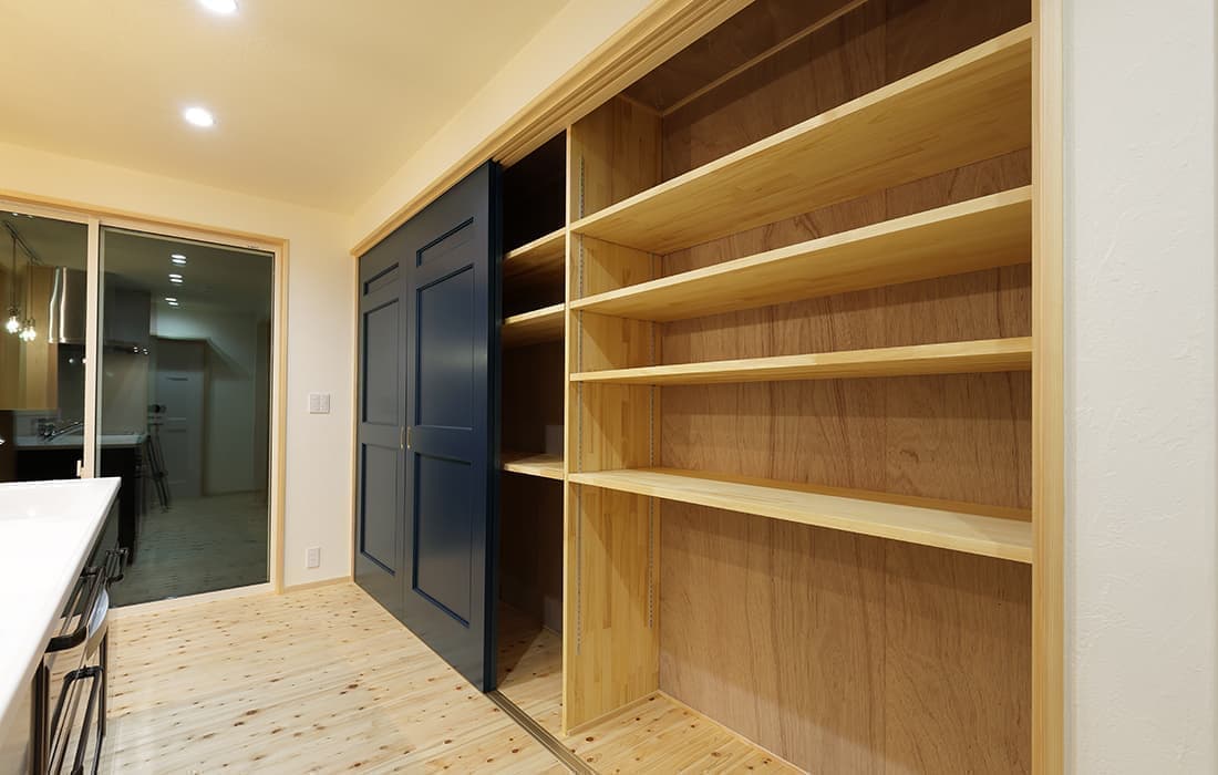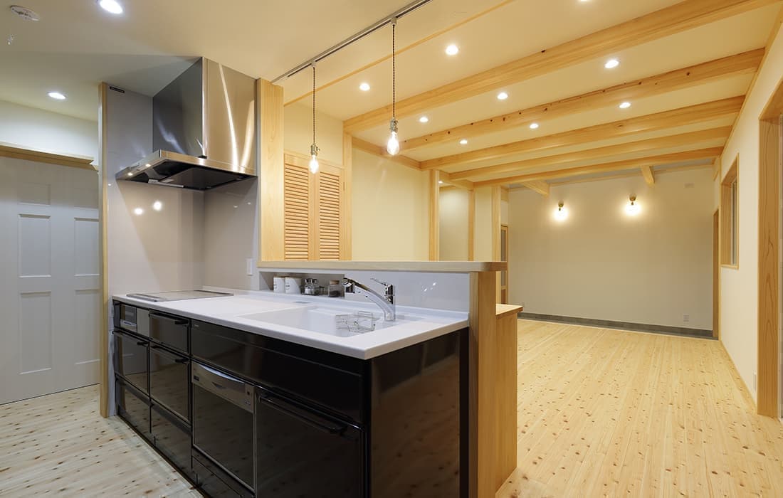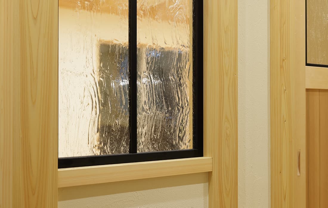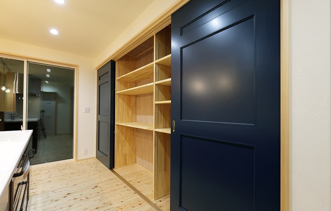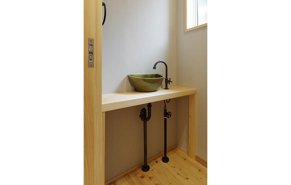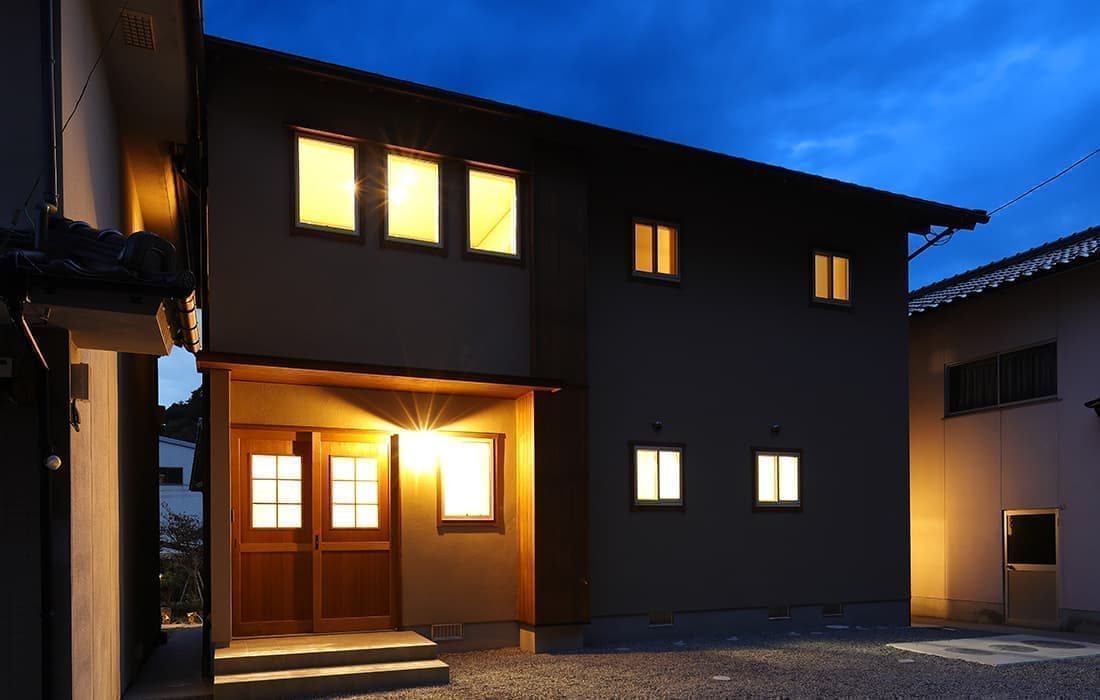 日本家屋の玄関にある土間。もともとは家に上がる為のスペースであった土間が近年では家全体の印象をつける場所となります。土間のスペースを広くとり、おしゃれな空間を演出する場所。薪ストーブを置ける場所。コミュニケーションの場として多様な使い方が出来ます。内部には県産材をたくさん使い構造材、柱、フローリング全てに至るまで無垢のヒノキ材を使用しています。土間とつながるLDKは、尾引天井で空間を広くし珪藻土の柔らかみとネイビーの建具でアクセントのある雰囲気に。リビングに入る建具にはアンティークガラスと黒のアイアンでおしゃれに演出。随所に真鍮をあしらい細部までこだわり。優しい色合いの自然素材を基調としたナチュラルな外観。杉板の柱と木の縁取りをした窓枠、玄関ドアもオリジナル木製建具で柔らかい印象に。