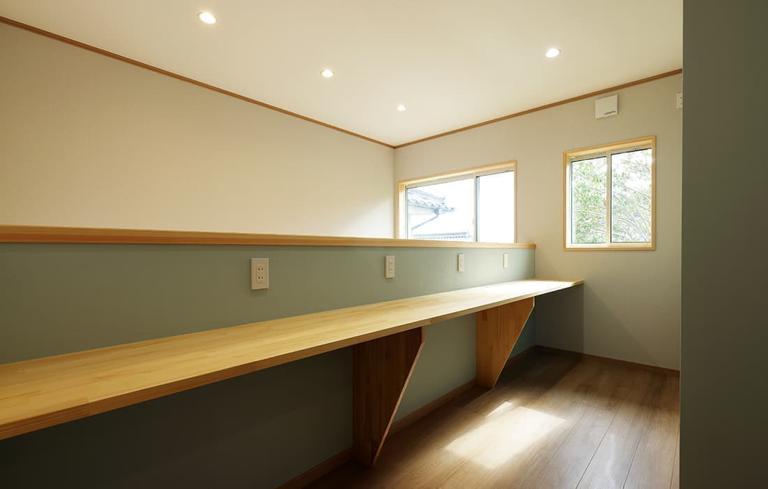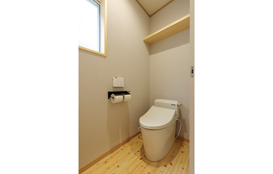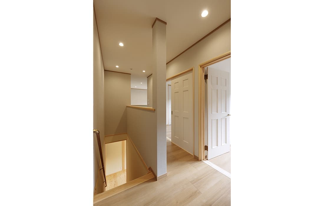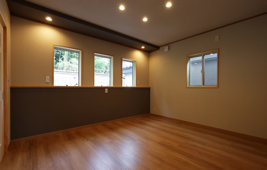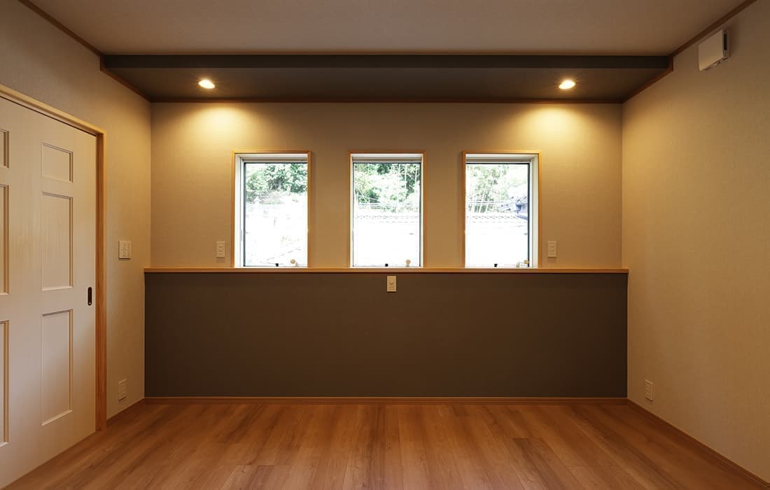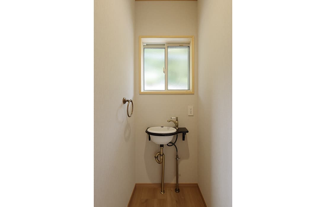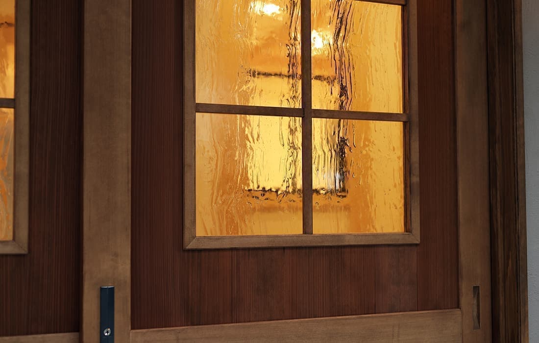 日本家屋の玄関にある土間。もともとは家に上がる為のスペースであった土間が近年では家全体の印象をつける場所となります。土間のスペースを広くとり、おしゃれな空間を演出する場所。薪ストーブを置ける場所。コミュニケーションの場として多様な使い方が出来ます。内部には県産材をたくさん使い構造材、柱、フローリング全てに至るまで無垢のヒノキ材を使用しています。土間とつながるLDKは、尾引天井で空間を広くし珪藻土の柔らかみとネイビーの建具でアクセントのある雰囲気に。リビングに入る建具にはアンティークガラスと黒のアイアンでおしゃれに演出。随所に真鍮をあしらい細部までこだわり。優しい色合いの自然素材を基調としたナチュラルな外観。杉板の柱と木の縁取りをした窓枠、玄関ドアもオリジナル木製建具で柔らかい印象に。