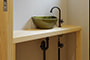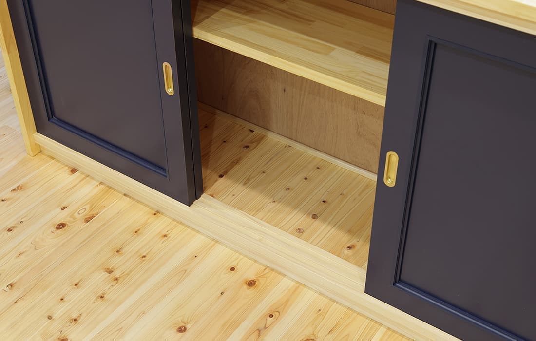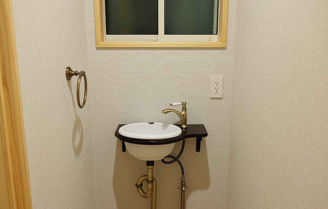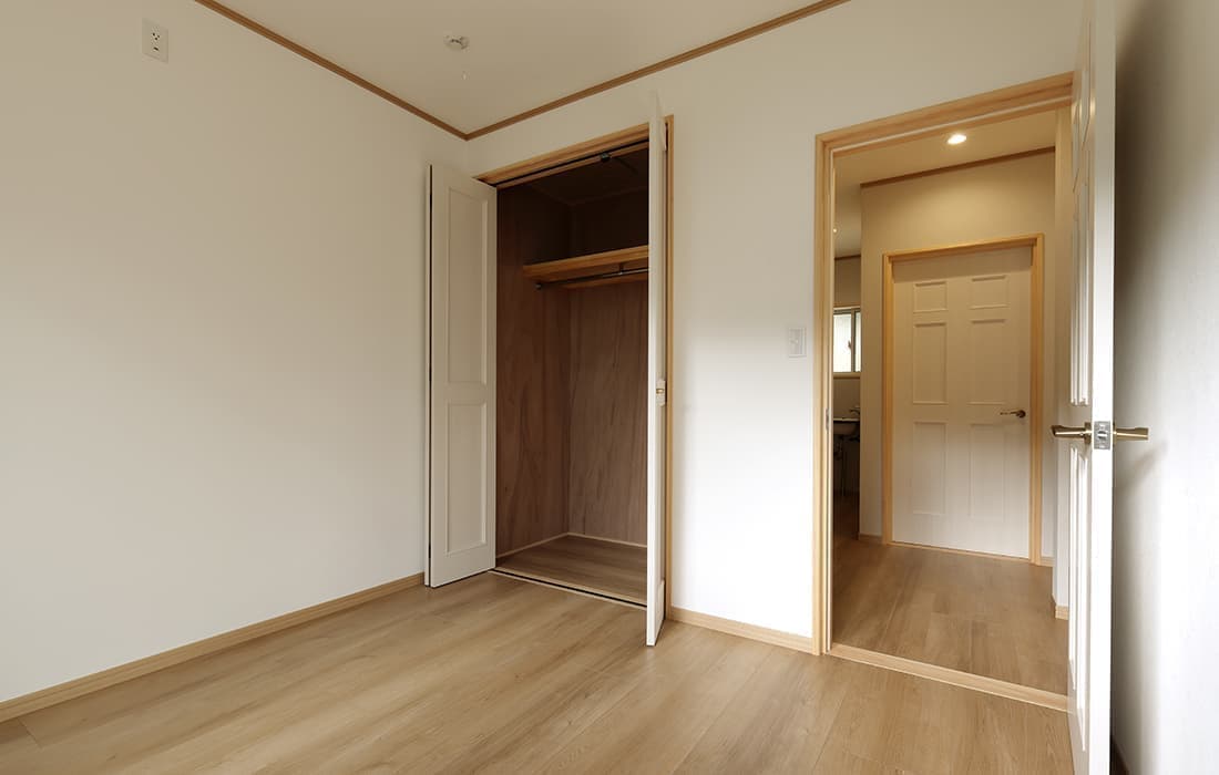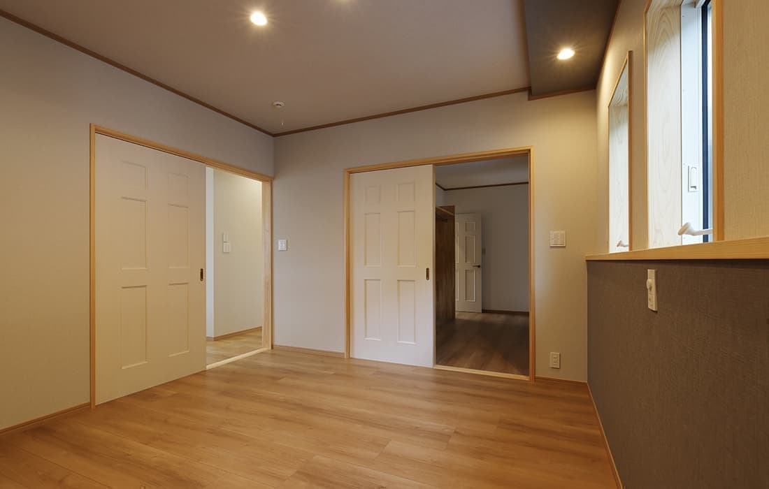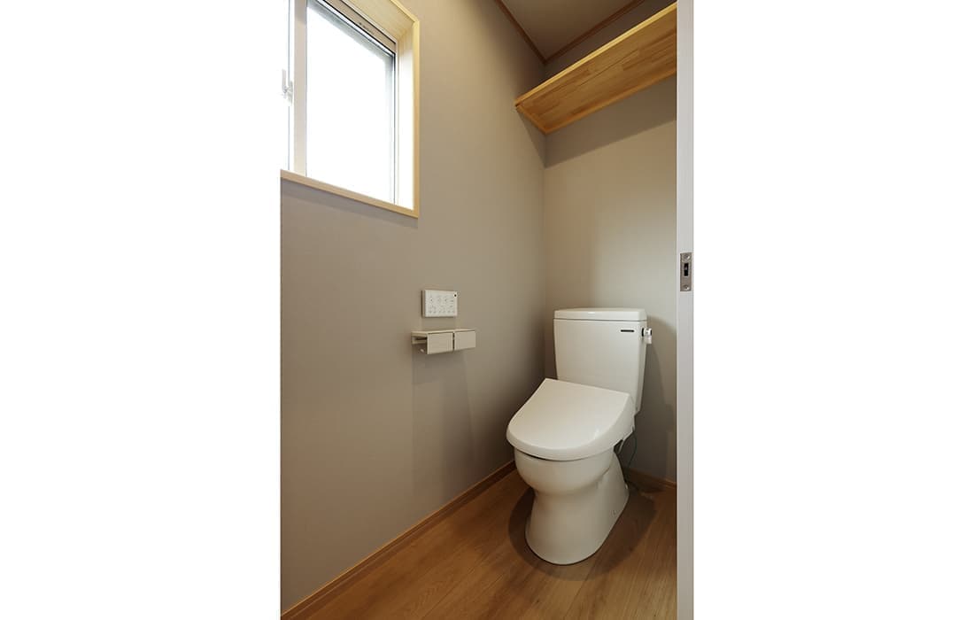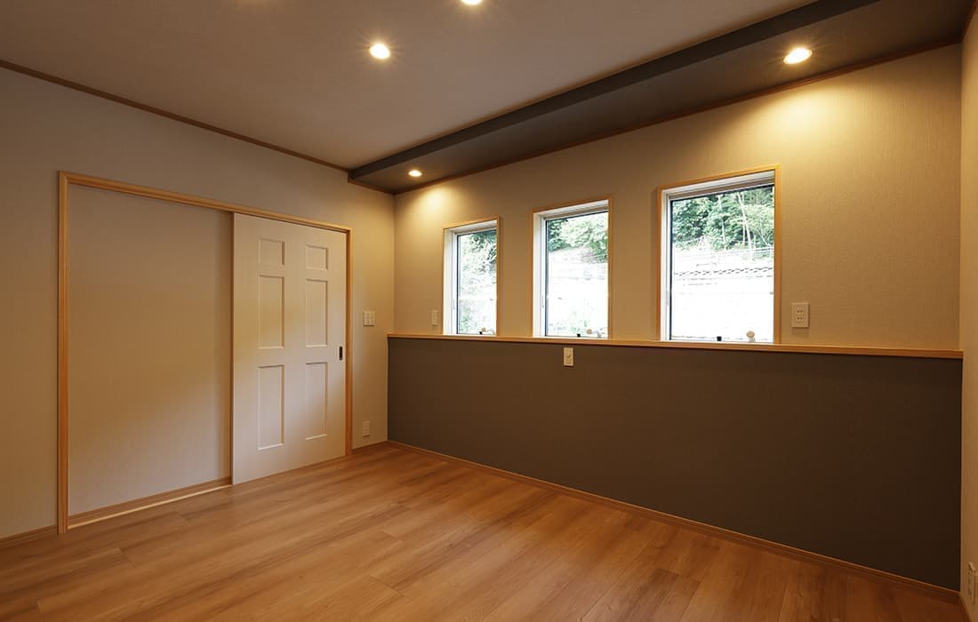 日本家屋の玄関にある土間。もともとは家に上がる為のスペースであった土間が近年では家全体の印象をつける場所となります。土間のスペースを広くとり、おしゃれな空間を演出する場所。薪ストーブを置ける場所。コミュニケーションの場として多様な使い方が出来ます。内部には県産材をたくさん使い構造材、柱、フローリング全てに至るまで無垢のヒノキ材を使用しています。土間とつながるLDKは、尾引天井で空間を広くし珪藻土の柔らかみとネイビーの建具でアクセントのある雰囲気に。リビングに入る建具にはアンティークガラスと黒のアイアンでおしゃれに演出。随所に真鍮をあしらい細部までこだわり。優しい色合いの自然素材を基調としたナチュラルな外観。杉板の柱と木の縁取りをした窓枠、玄関ドアもオリジナル木製建具で柔らかい印象に。