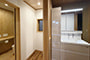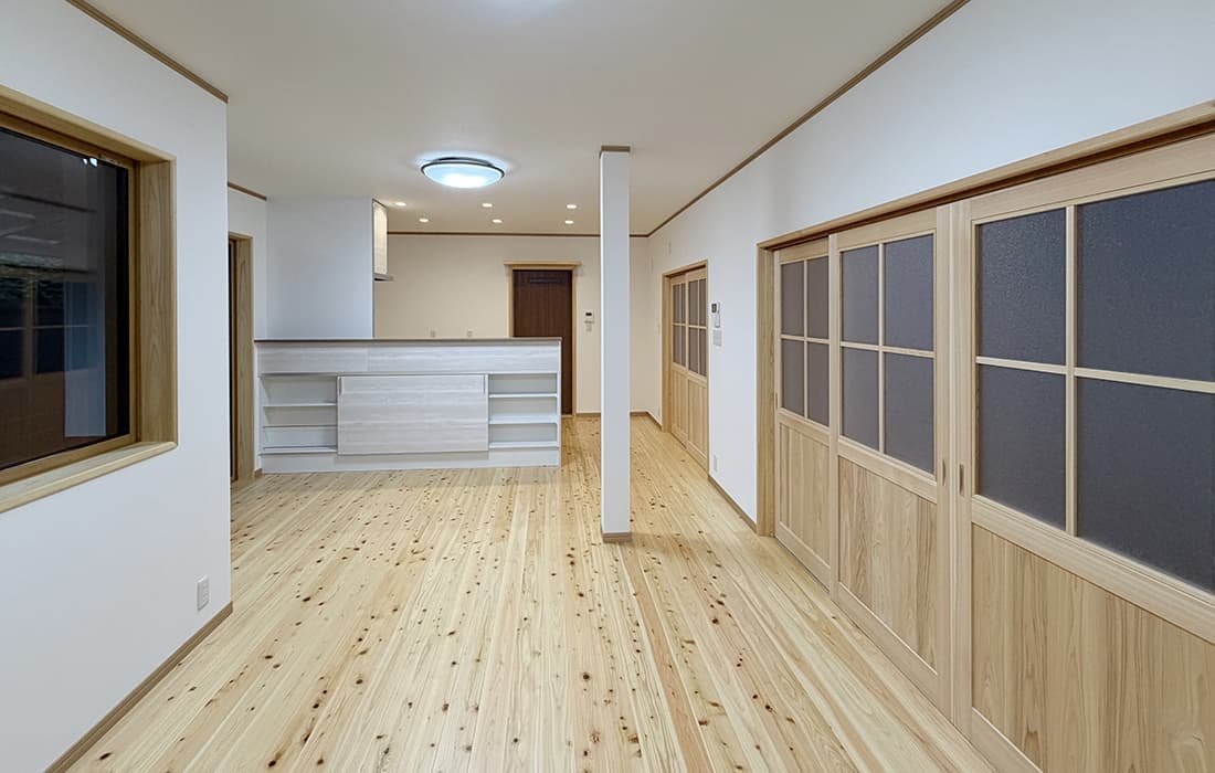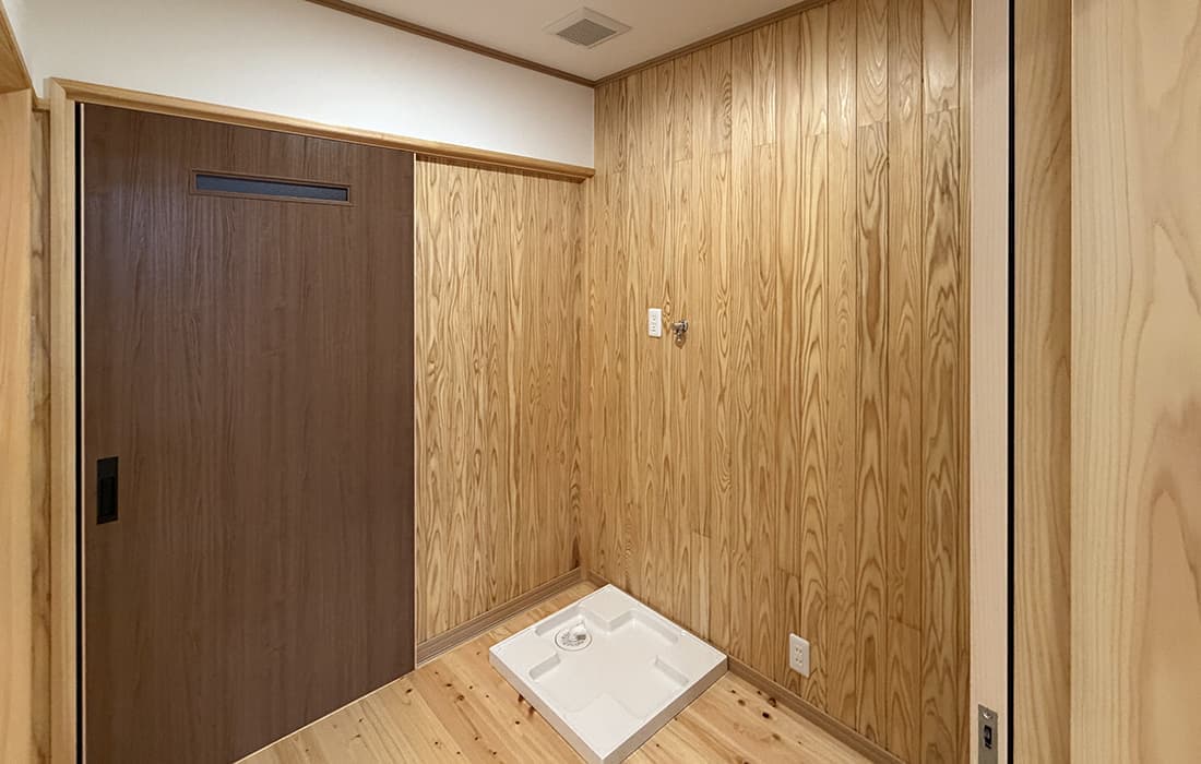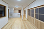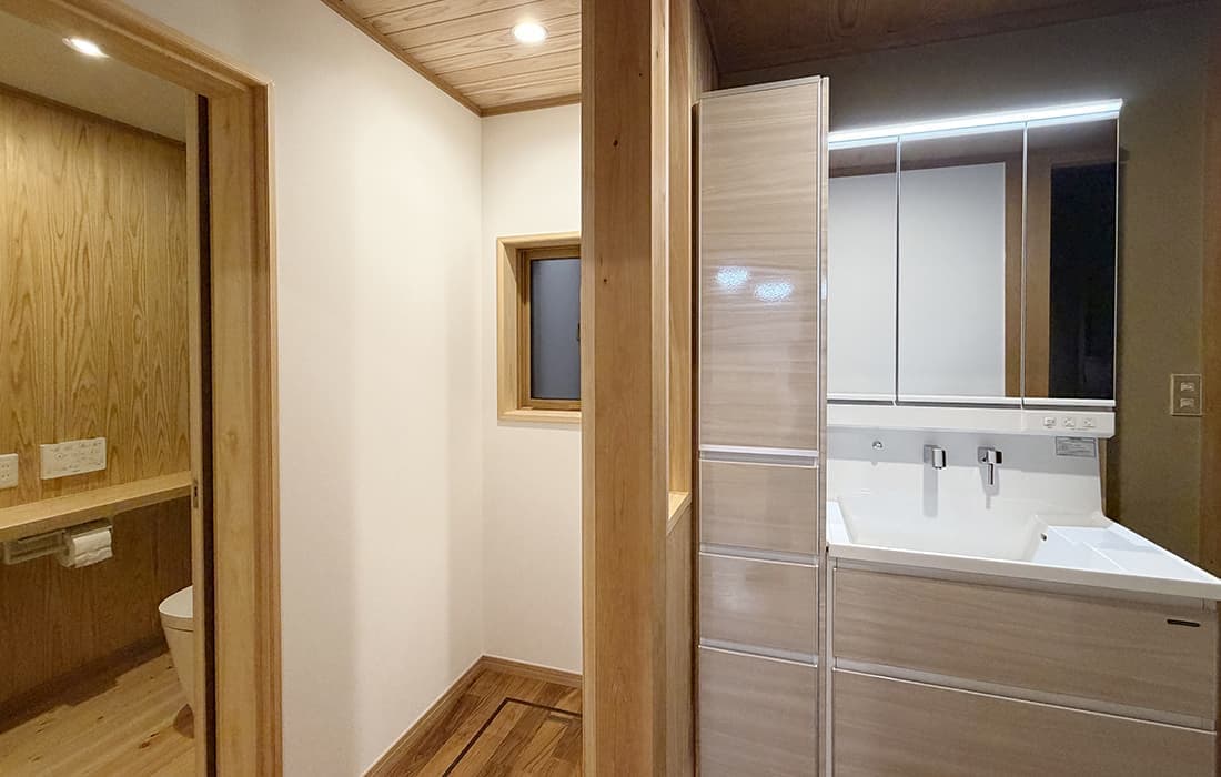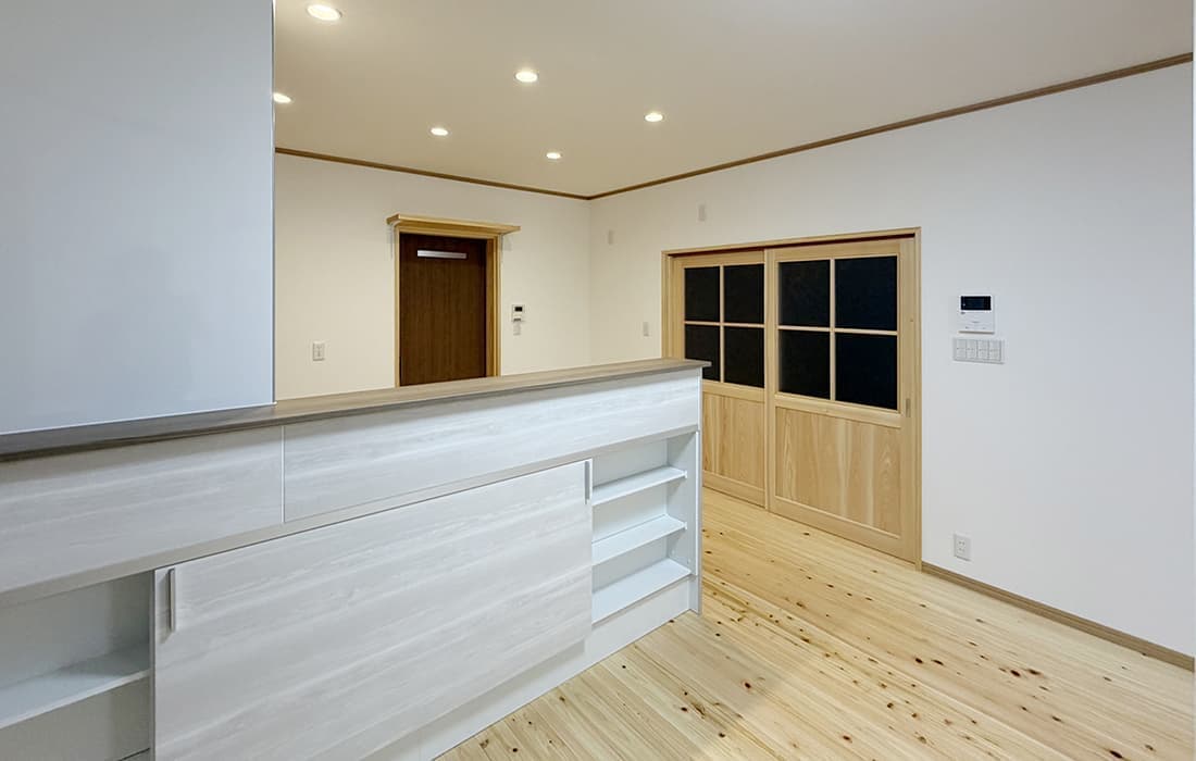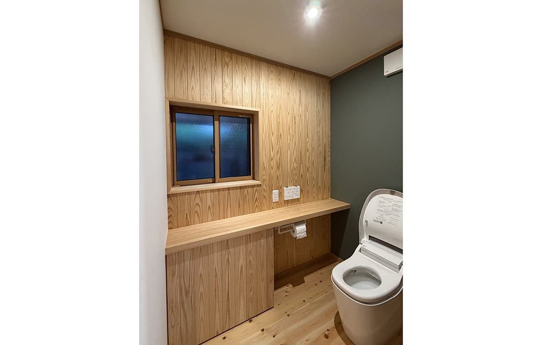 リビングと台所がそれぞれ独立していた間取りを見直し、一体化。開放感あふれる、広々としたLDKへと生まれ変わりました。施工前は壁付けだったキッチンを、対面キッチンへ変更。動線がスムーズになり、使い勝手はもちろん、デザイン性や収納力も向上しています。また、一部にあった出っ張り部分は、柱を抜いてしっかりと補強し、斜めの壁を設けることで、空間を有効活用。広く、より使いやすいレイアウトを実現しました。建具には無垢材を使用し、空間全体の雰囲気もやさしく一新。トイレのカウンターには桧の無垢材を採用し、色分けを施すことで、落ち着きのある心地よい空間に仕上げています。