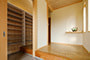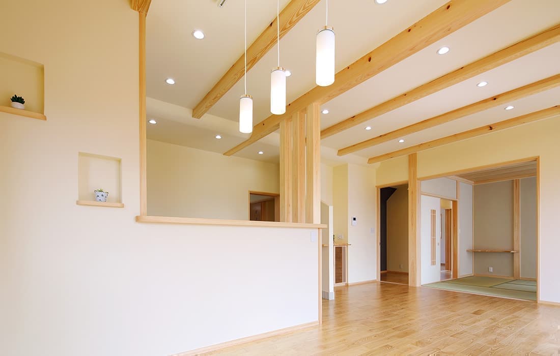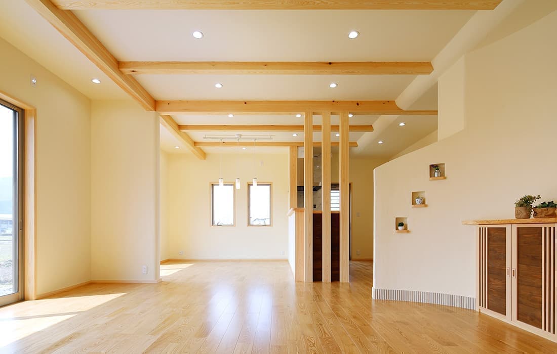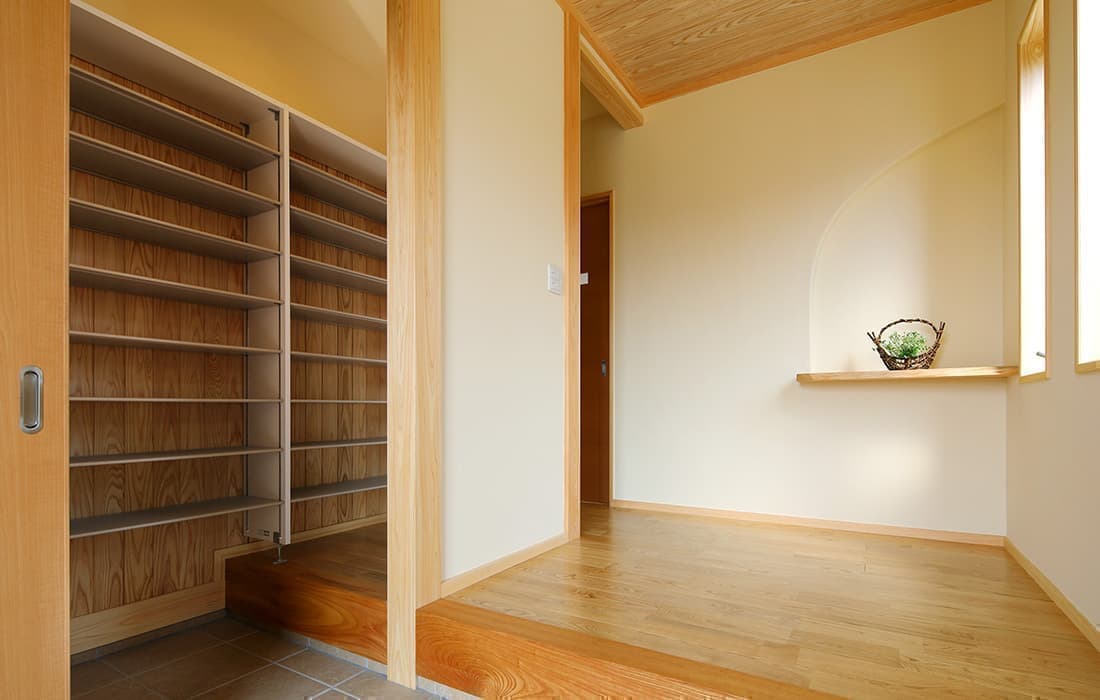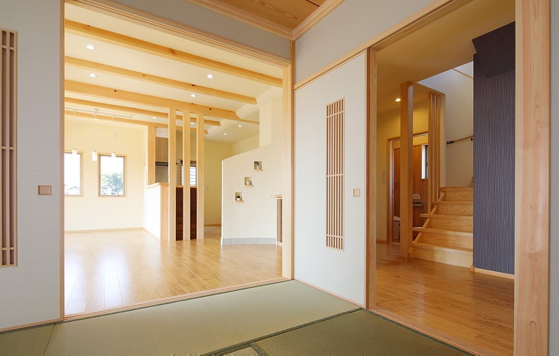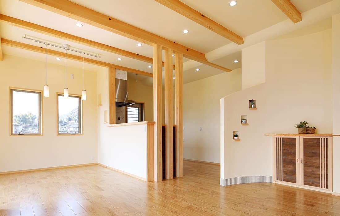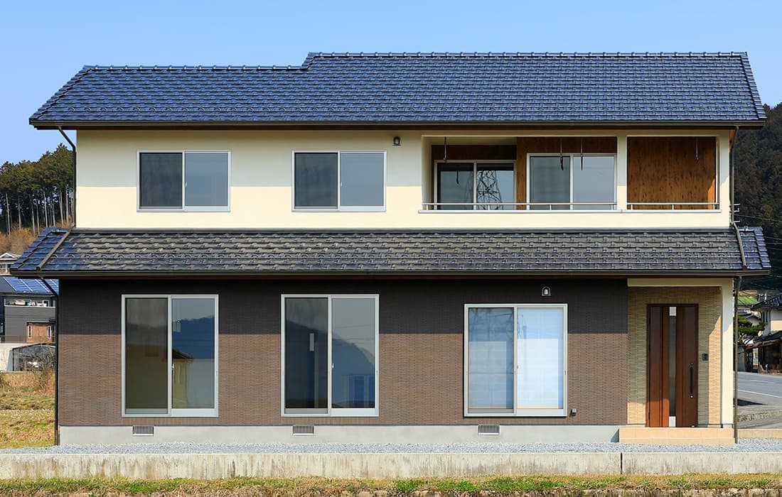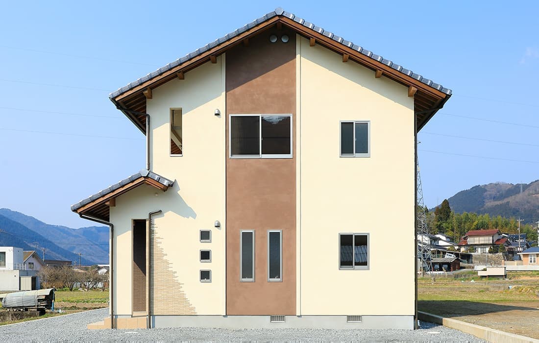 「木組みの家」洋風モダン住宅 リビングのR壁が魅力的な家 新築 ブラウンの外壁と玄関のタイルがモダンな外観です。玄関には土間収納スペースがあり、掃除用品もすっきり収納できます。框にはケヤキ材(銘木)で、柱にはすべて桧の4寸角(無垢)を使用。LDKは19帖と広々しています。リビングのR壁が魅力的でキッチンから洗面・浴室と繋がり家事動線も短くなるように考えています。リビングからつながる和室はたくさんのお客様にも対応できます。小屋裏収納や夫婦寝室の横にはWクローゼットで収納力抜群です。 前へ 建築実例一覧 次へ