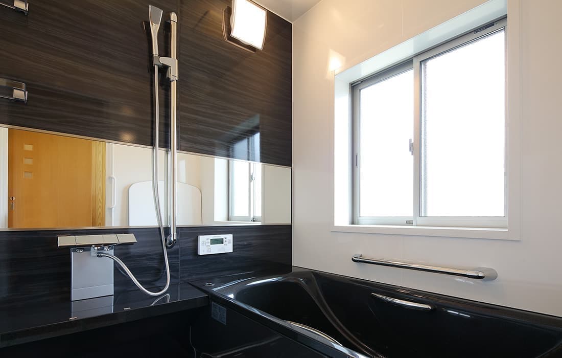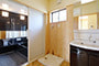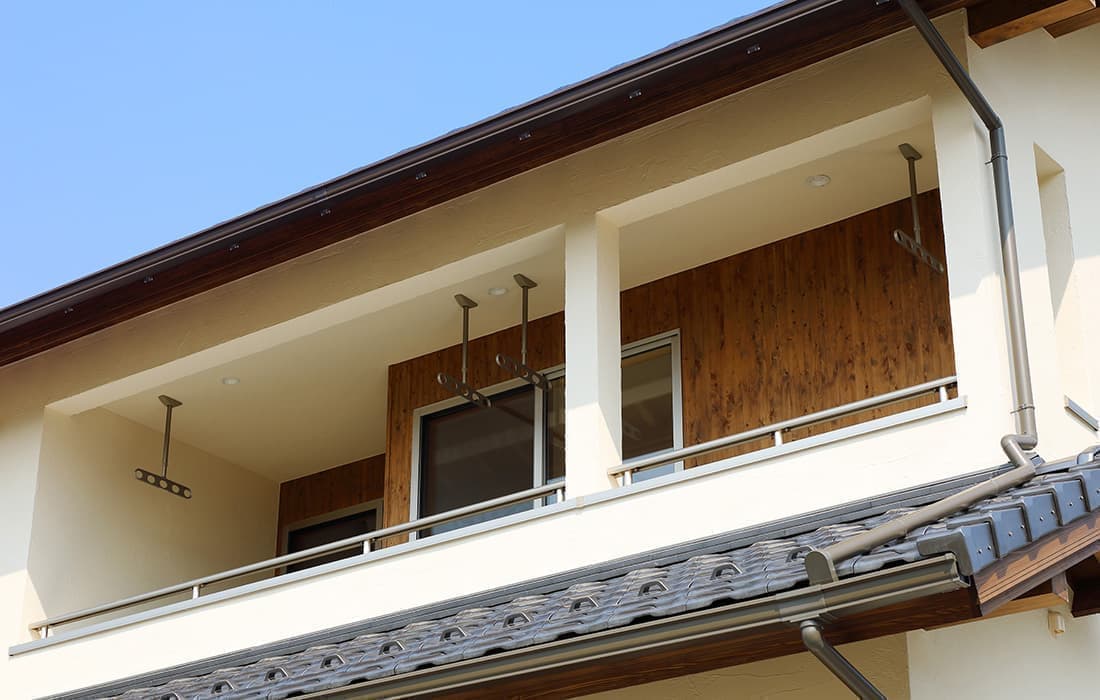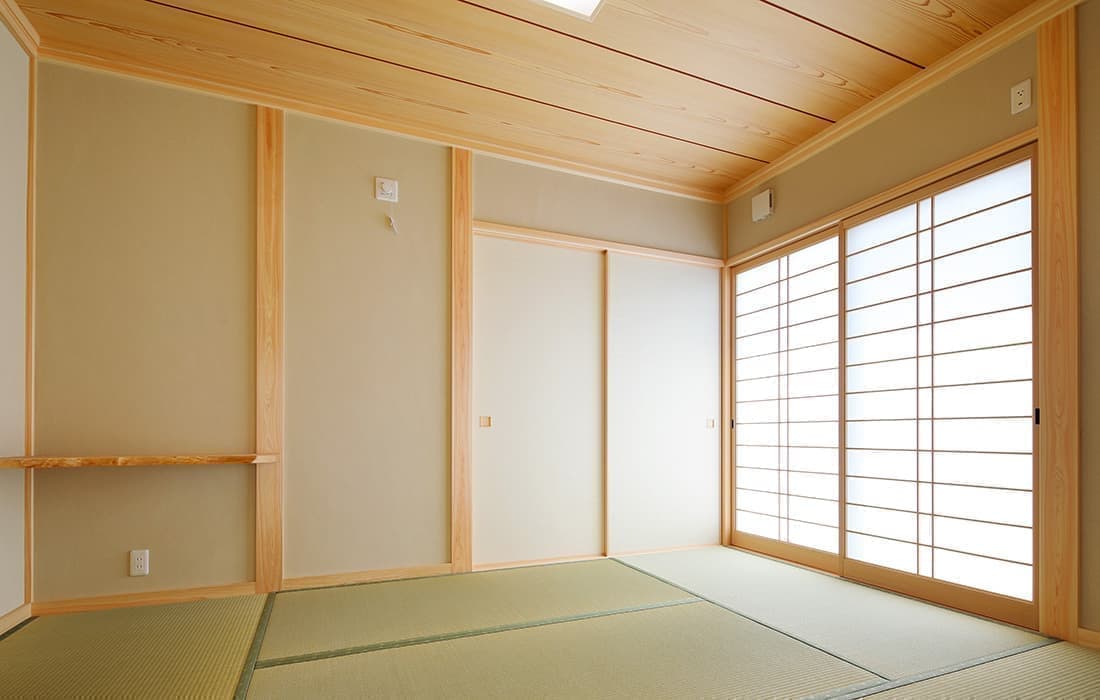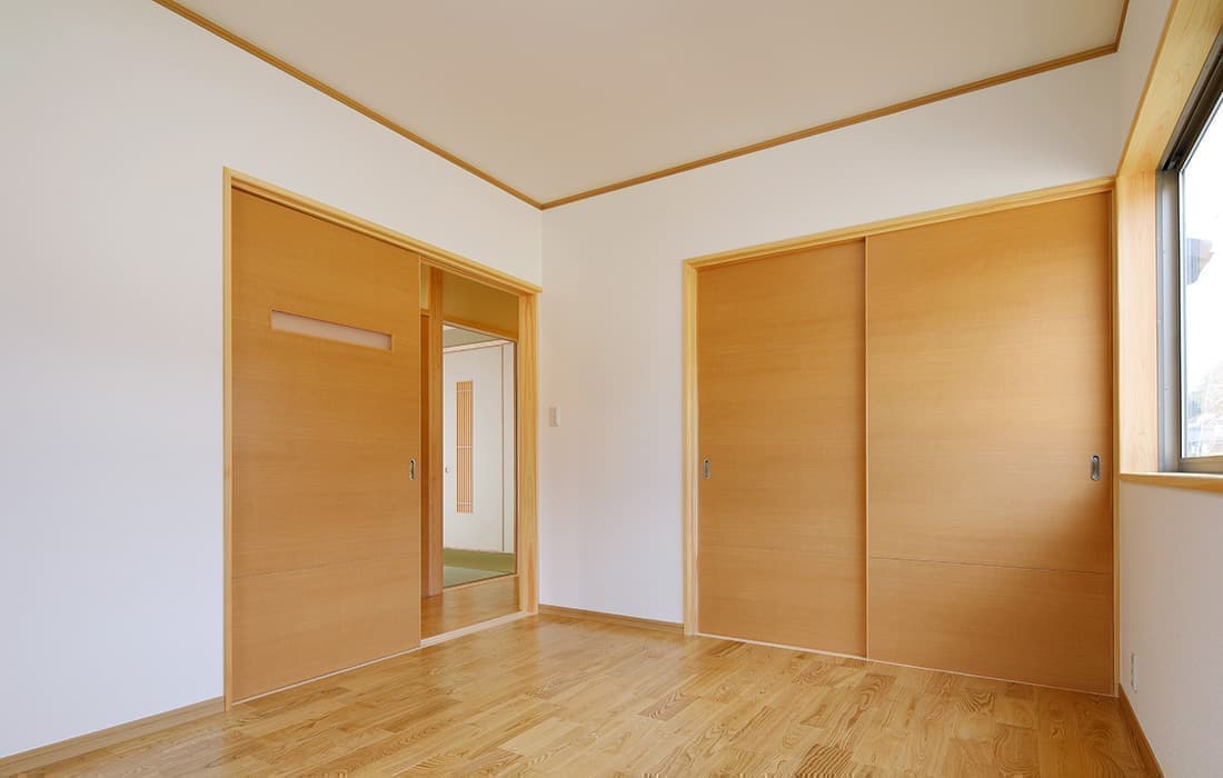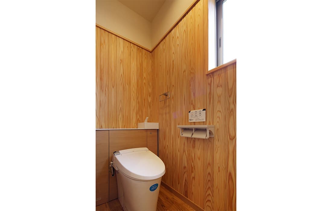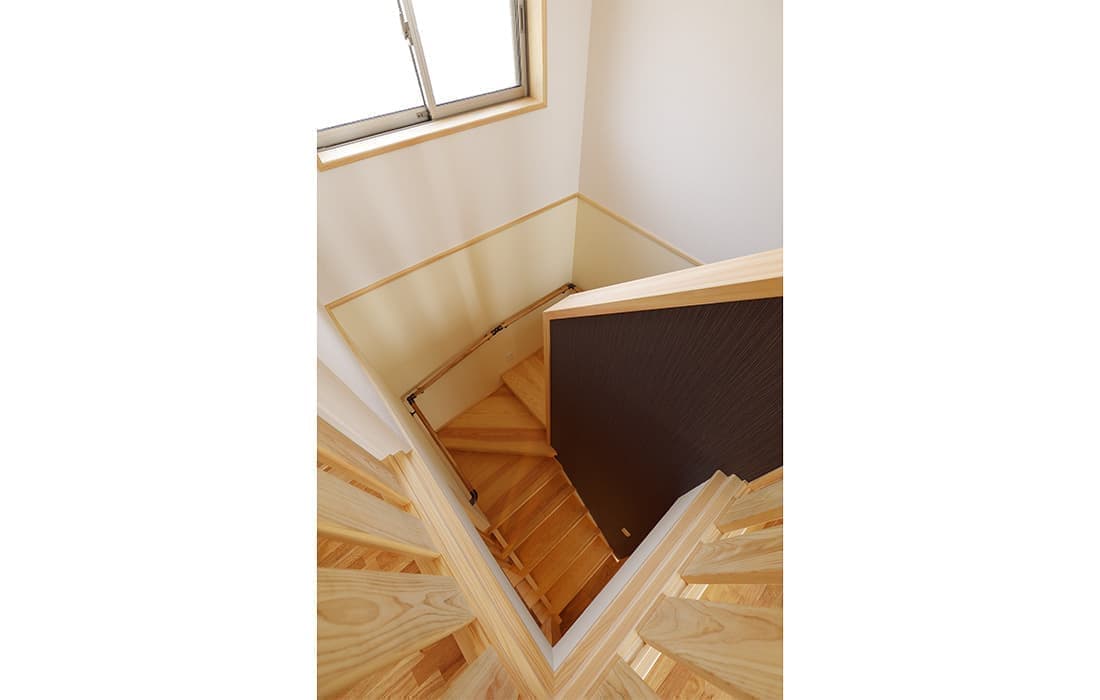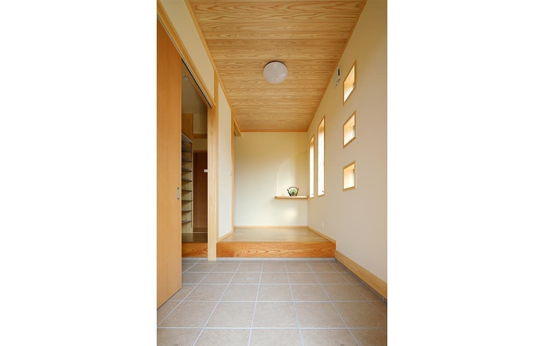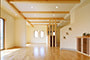 「木組みの家」洋風モダン住宅 リビングのR壁が魅力的な家 新築 ブラウンの外壁と玄関のタイルがモダンな外観です。玄関には土間収納スペースがあり、掃除用品もすっきり収納できます。框にはケヤキ材(銘木)で、柱にはすべて桧の4寸角(無垢)を使用。LDKは19帖と広々しています。リビングのR壁が魅力的でキッチンから洗面・浴室と繋がり家事動線も短くなるように考えています。リビングからつながる和室はたくさんのお客様にも対応できます。小屋裏収納や夫婦寝室の横にはWクローゼットで収納力抜群です。 前へ 建築実例一覧 次へ